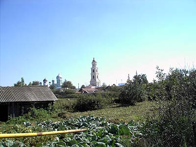 Вид на колокольню издали, через огороды с капустой. (на фото слева) |