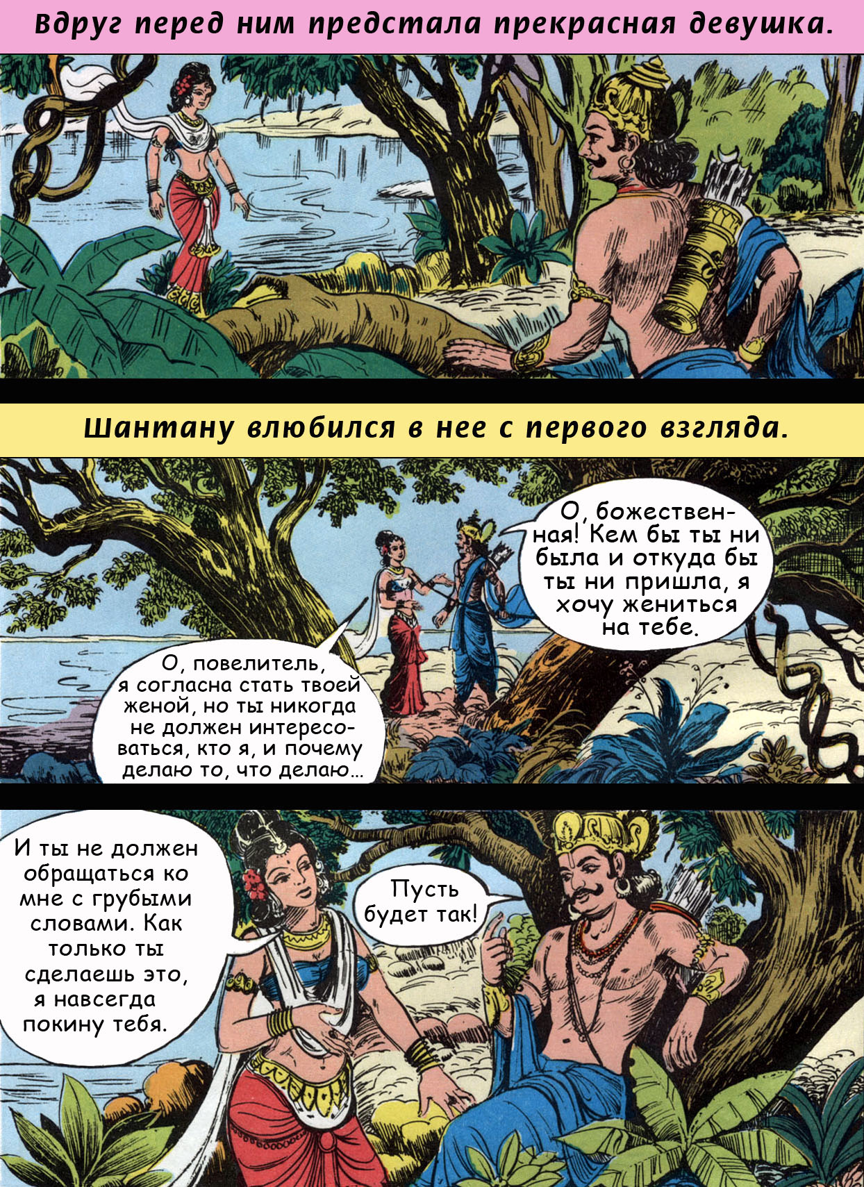 Восхищенный красотой, милым нравом девушки, чье тело благоухало, точно принадлежало богине, царь Шантану сильно возжелал ее. Он сразу же пошел к ее отцу и попросил выдать за него девушку.