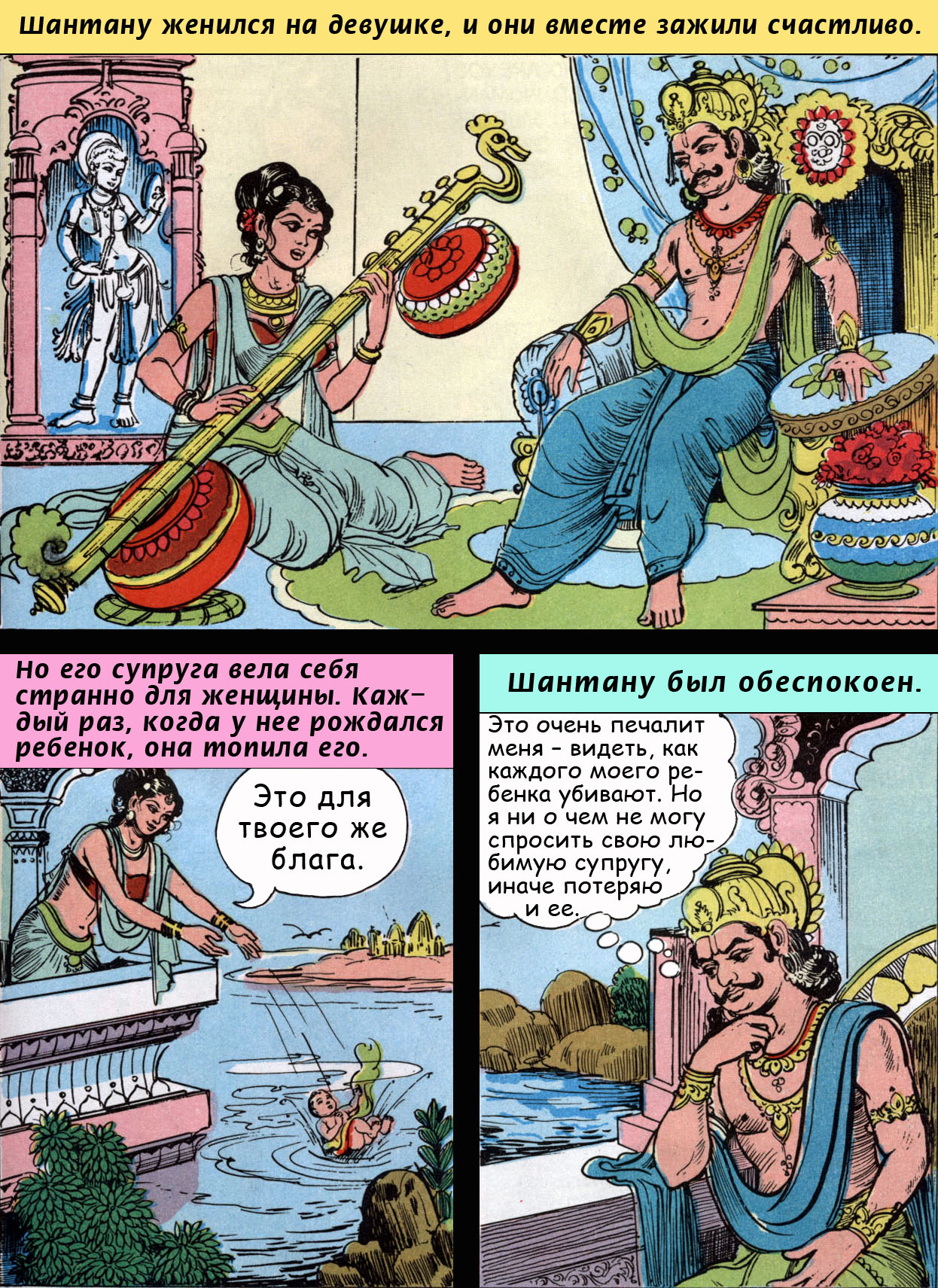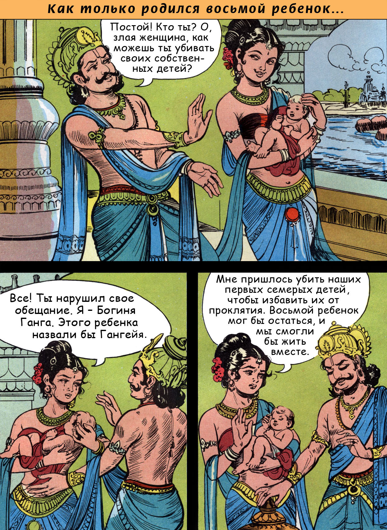 Шантану был совершенно покорен ее необыкновенной женской красотой и обаянием и так упоен их любовной близостью, что не замечал, как пролетают месяцы, времена года и целые годы. Наслаждаясь семейной жизнью, исполняя все свои желания, могучий царь породил восемь детей в утробе Ганги, и все они сверкали, словно бессмертные боги. Но каждого родившегося сына Ганга тотчас же относила к реке и бросала в воду, говоря: "Я поступаю, как хочу", и топила.