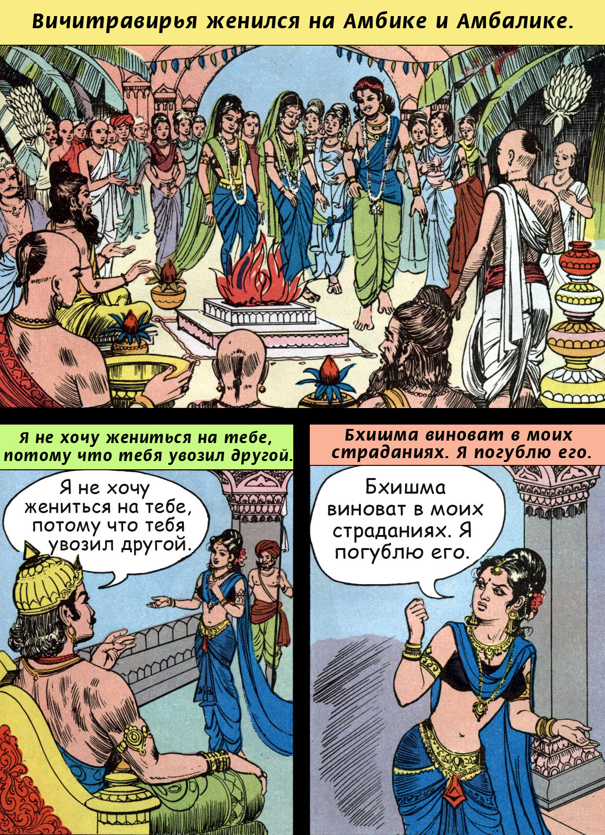 - Будучи достойным представителем своего отца Шантану, венценосца необыкновенного величия, ты наш господин, Деваврата. Ты честный, доброчестивый человек и хорошо знаеь, как справедливо решить это дело. Ты имеешь полное право решать, как должна быть выдана замуж моя дочь. Но я, исполняя свой отцовский долг перед любимой дочерью, должен сказать тебе следующее. О благородный царевич, есть еще одно смущающее меня обстоятельство.