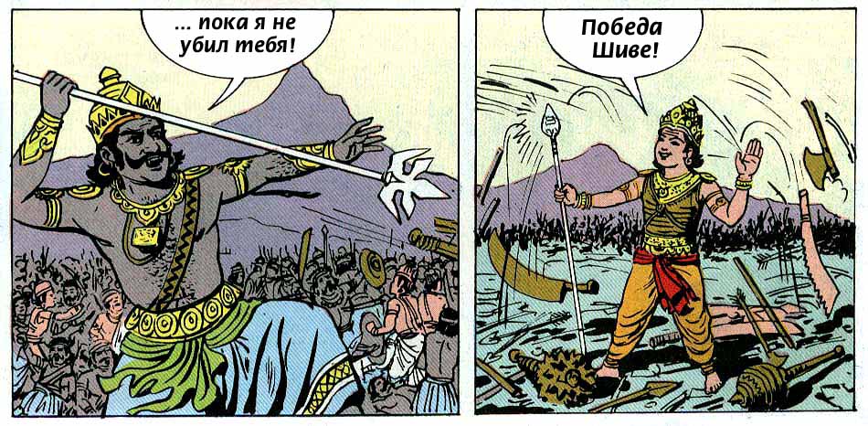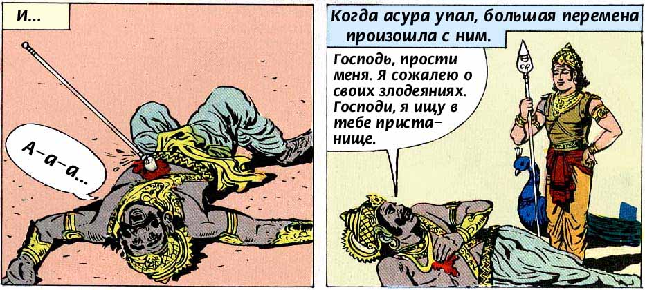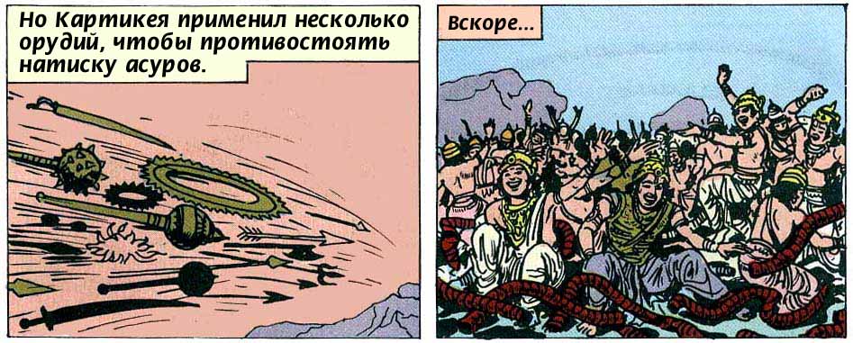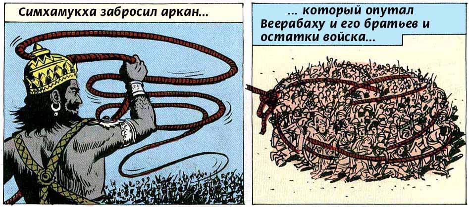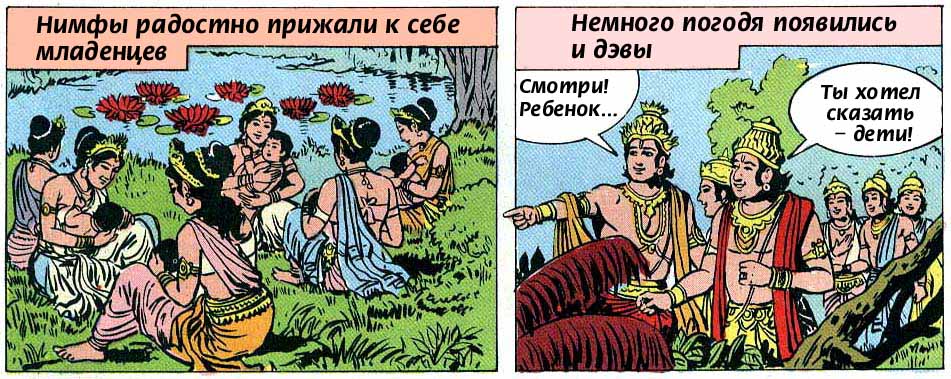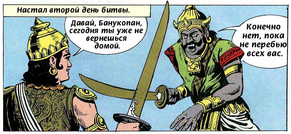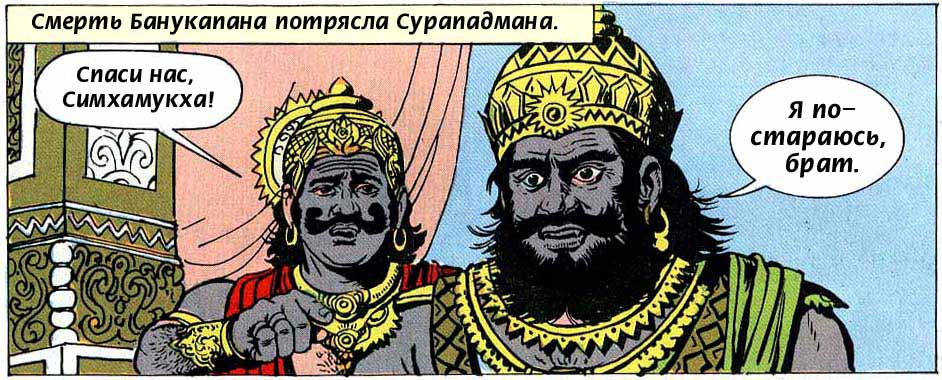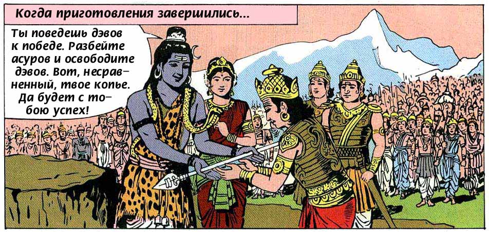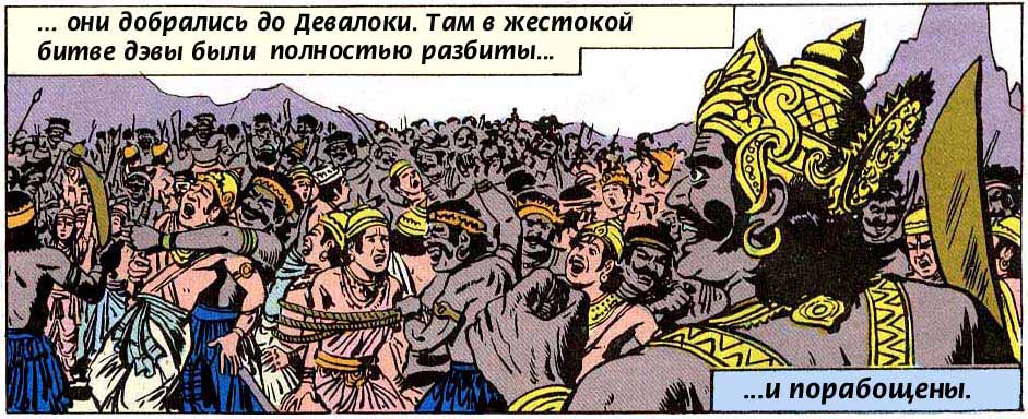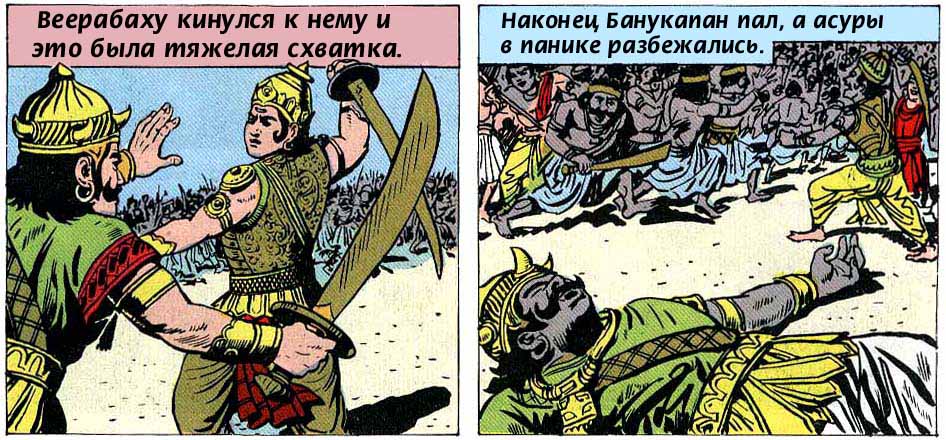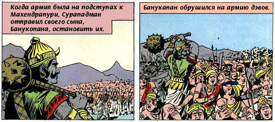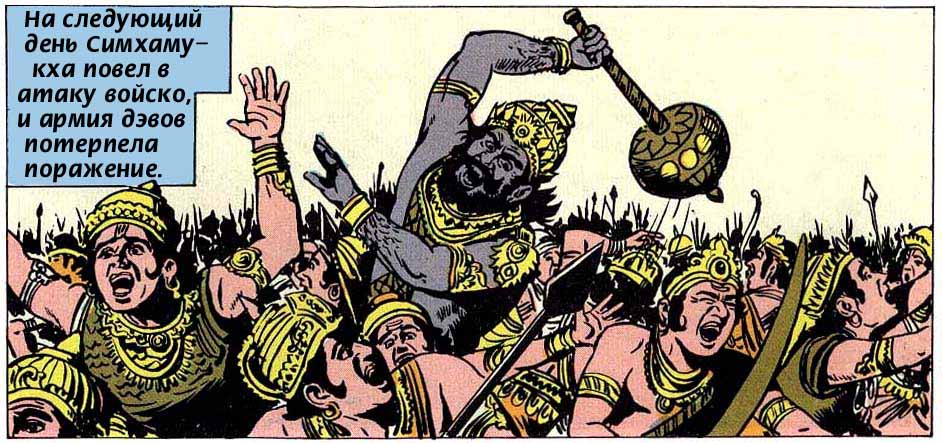 Затем Вишну, покинув образ девы несравненной красоты, издал грозный клич и привел демонов в трепет. Hа берегу Океана между богами и небогамн разгорелась из-за амриты ужаснейшая из битв. Тысячами посыпа лись стрелы и дротики, воздух рассекали мечи. Разрубленные диском, искалеченные мечами и дубинами небоги падали на землю. Их тела, обагренные кровью, образовывали горы. Боевые кличи и вопли достигали неба. Убедившись в превосходстве богов, уцелевшие небоги ушли под землю и в глубины соленых вод.