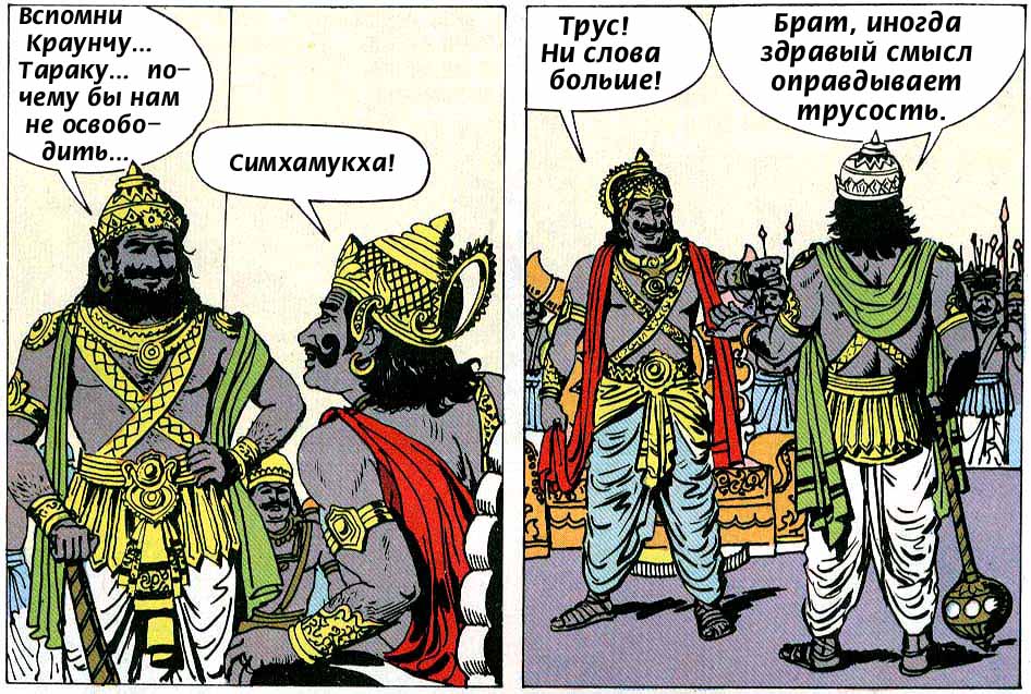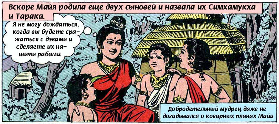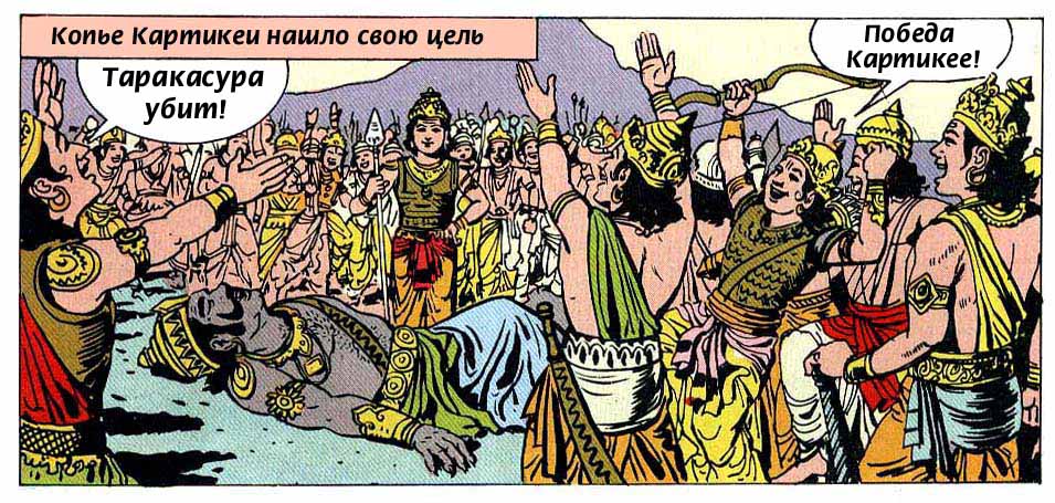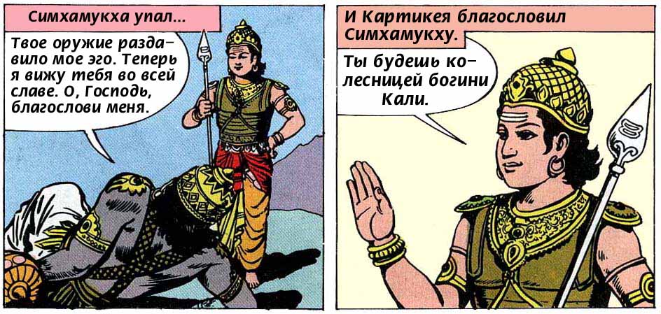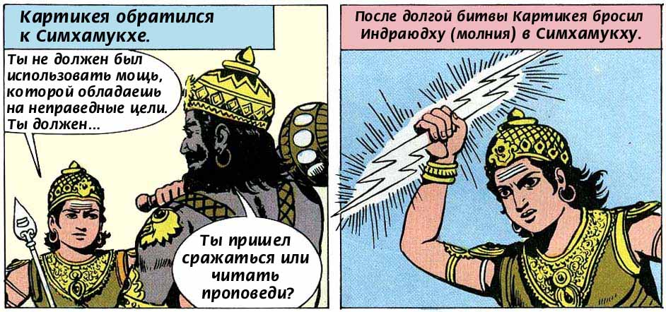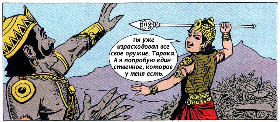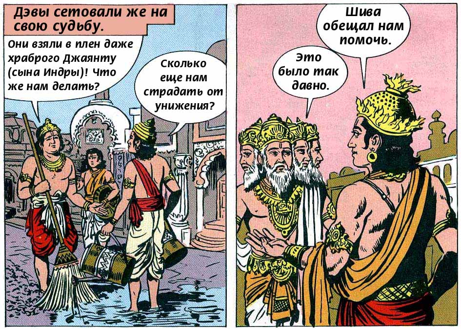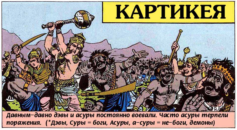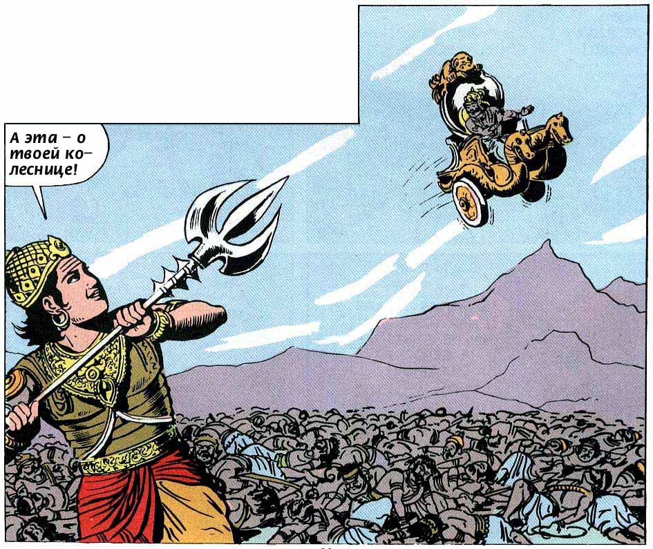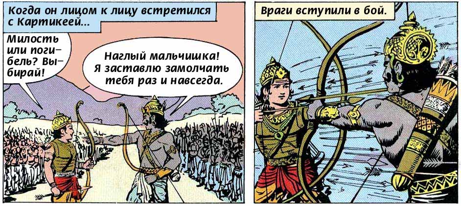 Затем Вишну, покинув образ девы несравненной красоты, издал грозный клич и привел демонов в трепет. Hа берегу Океана между богами и небогамн разгорелась из-за амриты ужаснейшая из битв. Тысячами посыпа лись стрелы и дротики, воздух рассекали мечи. Разрубленные диском, искалеченные мечами и дубинами небоги падали на землю. Их тела, обагренные кровью, образовывали горы. Боевые кличи и вопли достигали неба. Убедившись в превосходстве богов, уцелевшие небоги ушли под землю и в глубины соленых вод.