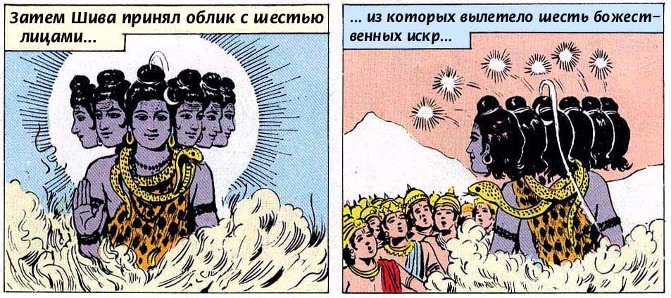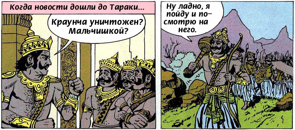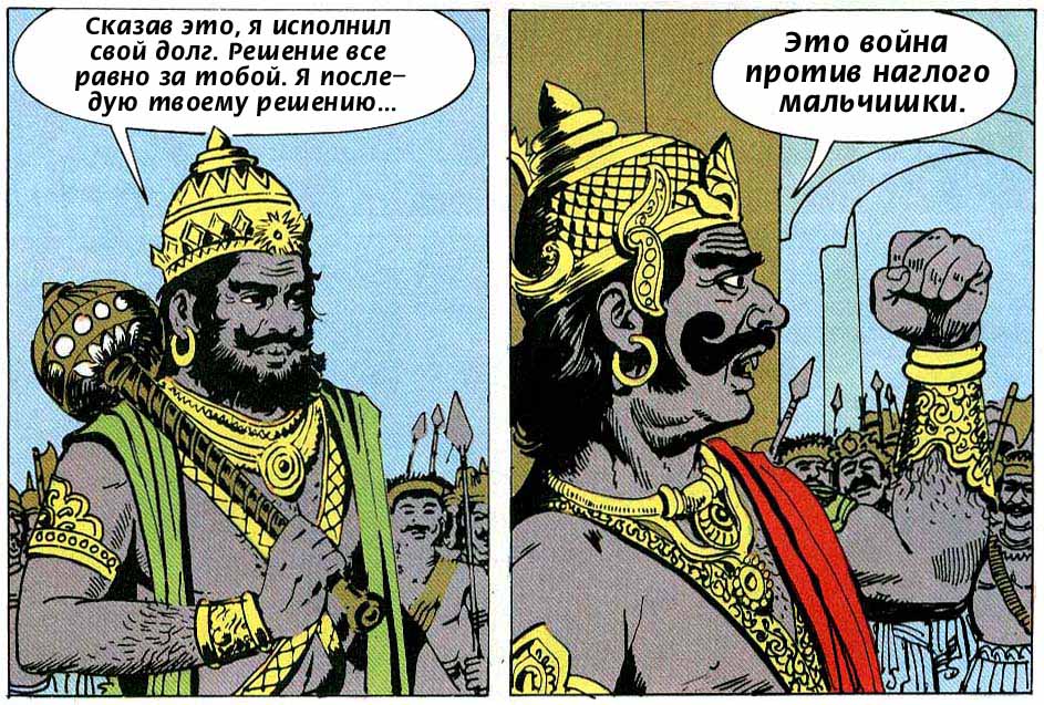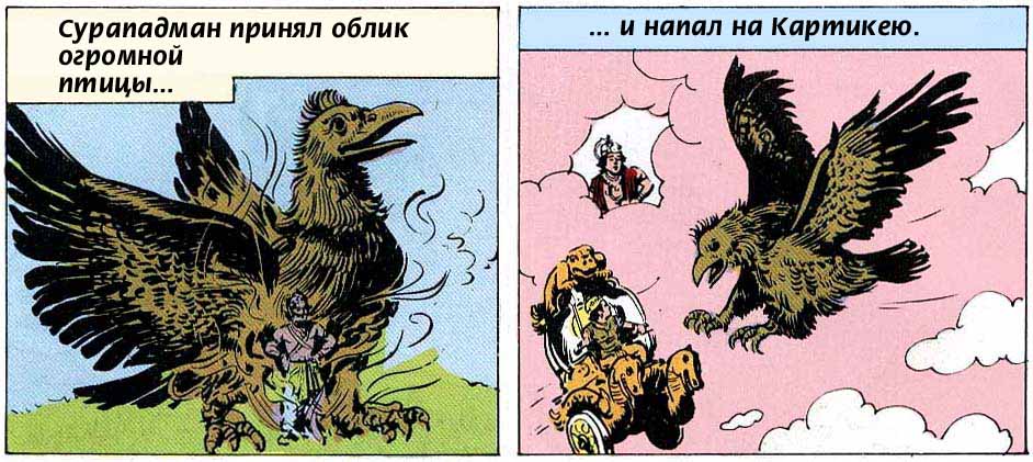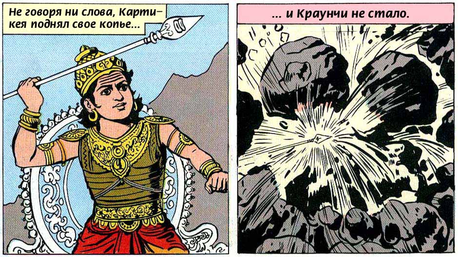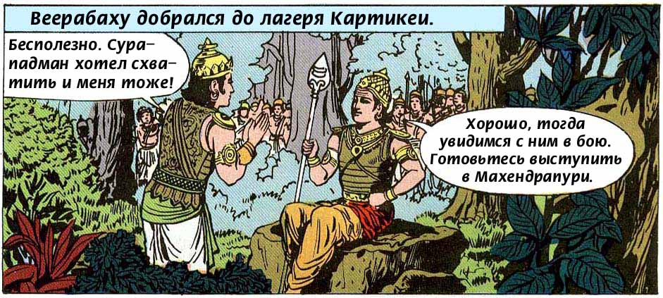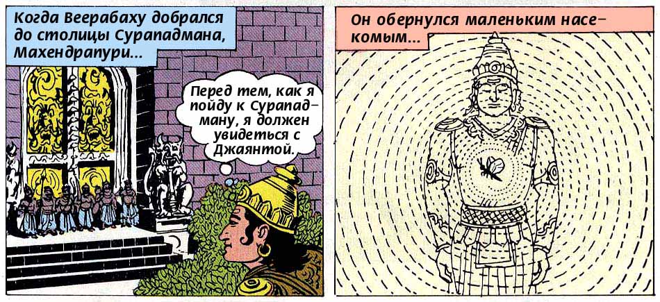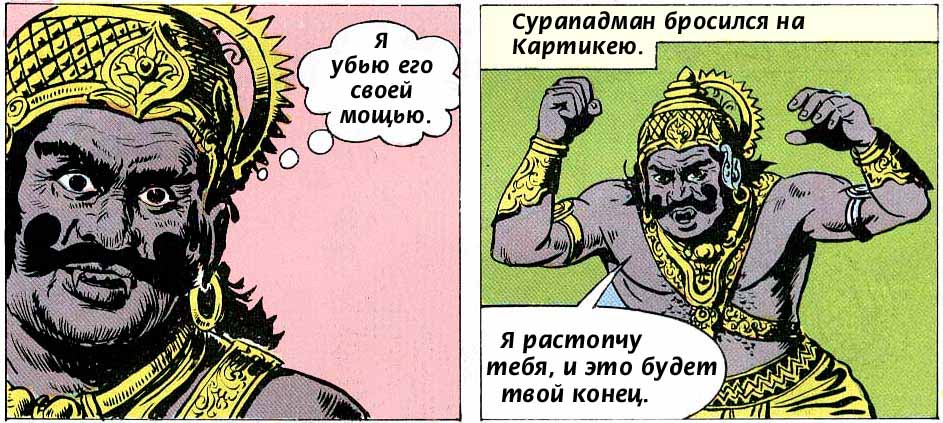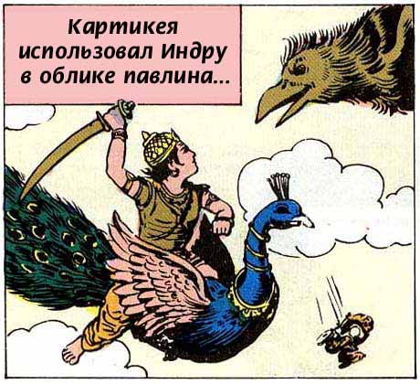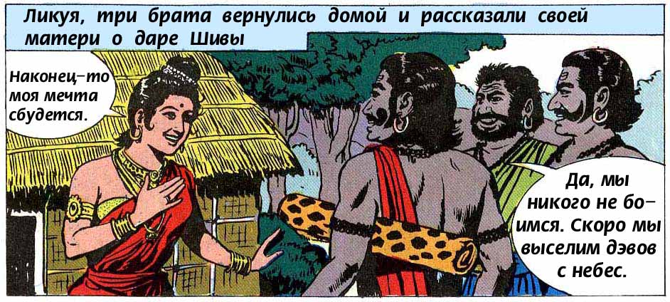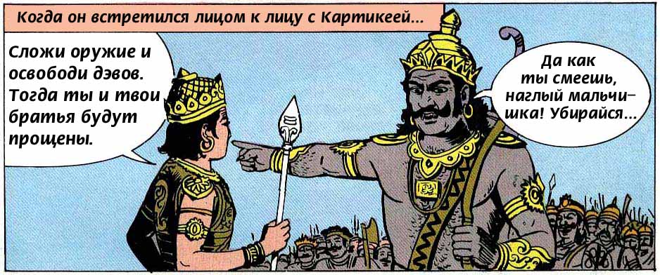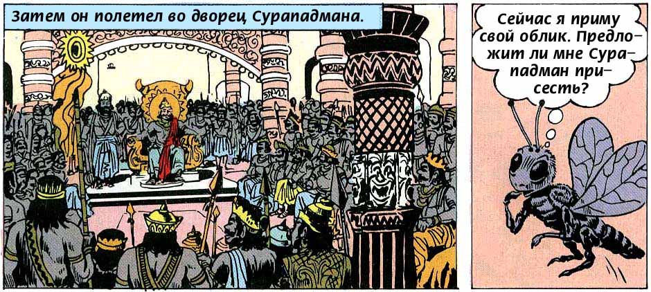 Затем Вишну, покинув образ девы несравненной красоты, издал грозный клич и привел демонов в трепет. Hа берегу Океана между богами и небогамн разгорелась из-за амриты ужаснейшая из битв. Тысячами посыпа лись стрелы и дротики, воздух рассекали мечи. Разрубленные диском, искалеченные мечами и дубинами небоги падали на землю. Их тела, обагренные кровью, образовывали горы. Боевые кличи и вопли достигали неба. Убедившись в превосходстве богов, уцелевшие небоги ушли под землю и в глубины соленых вод.
