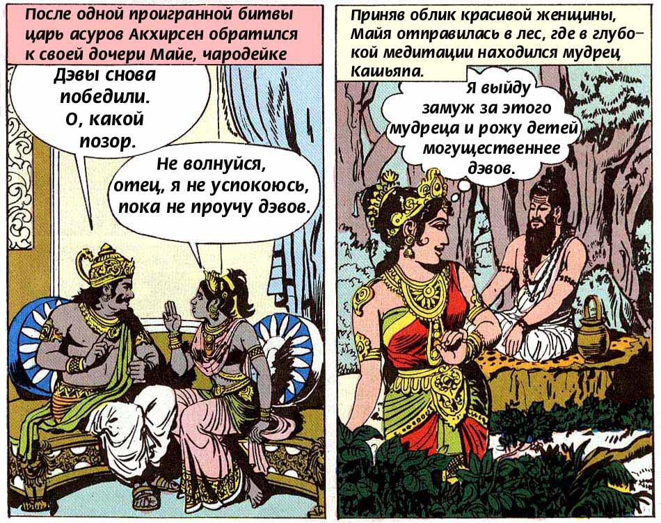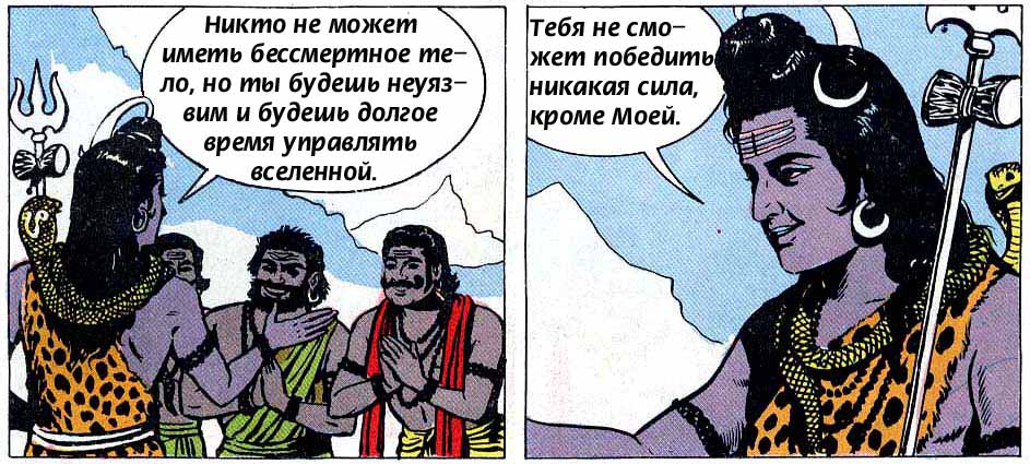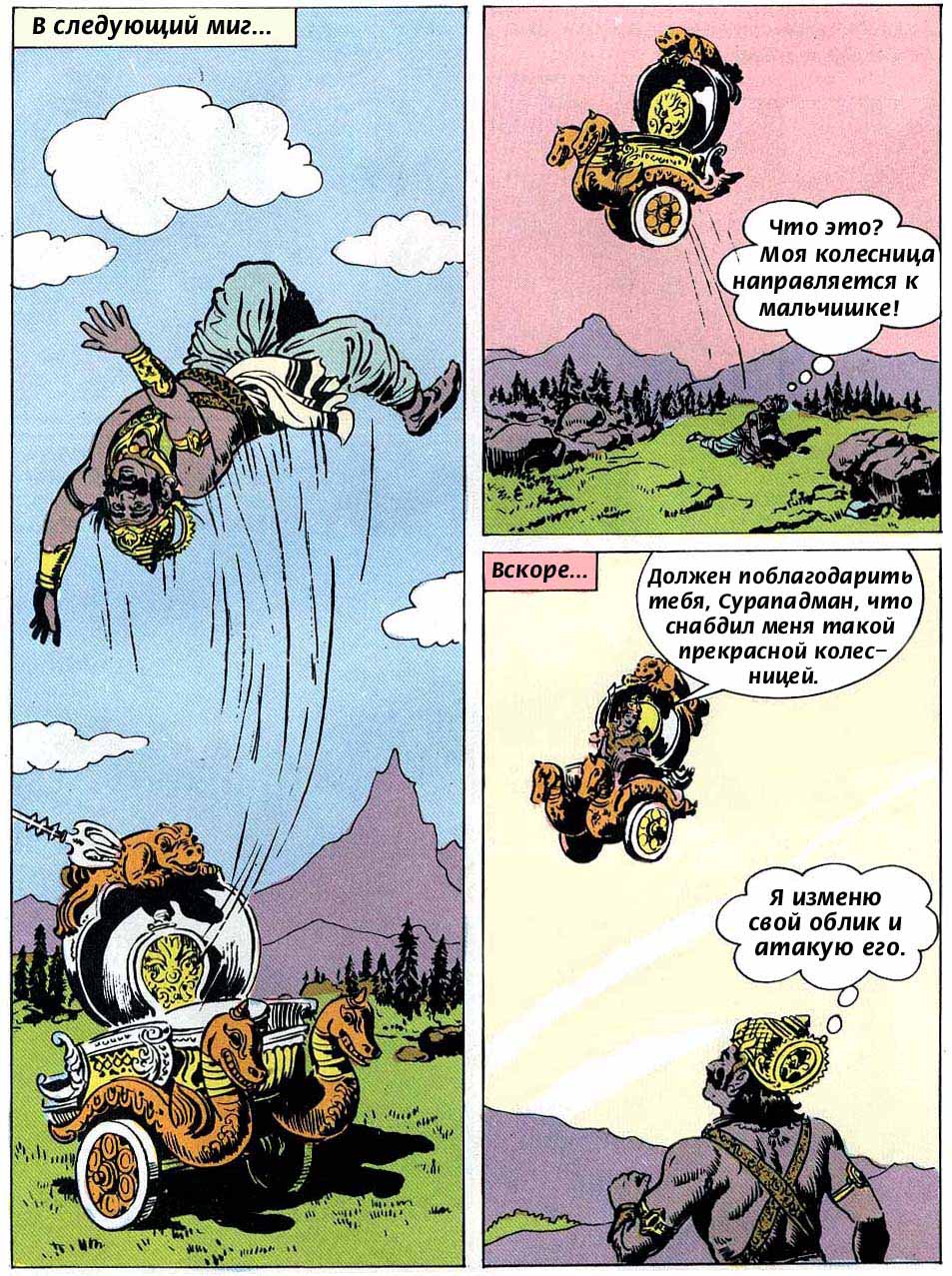 Вишну, обладавший даром перевоплощения, принял облик девы небесной красоты и втесался в толпу. При виде красавицы небоги потеряли рассудок и отдали ей сосуд с амритой, чтобы она распределила напиток по справедливости. Дева передала амриту богам, и те стали пить. Hебогов. опомнившихся от любовных чар, охватило смятение. Одному из них удалось принять облик бога и пригубить сосуд с амритой. Заметили это Месяц и Солнце с высоты и возвестили всепреподобному Вишну о хитрости небога. Метнул разъяренный Вишну свой не дающий промаха диск(Сударшана-Чакра, абсолютное оружие, привилегия только Всевышнего), и скатилась огромная голова, подобная вершине горы, с туловища. С той поры, обретя от глотка амриты бессмертие, находится эта голова небога во вражде с Месяцем и Солнцем. Она преследует то одного, то другого, нагнав, впивается в их края и проглатывает. Hо Месяц и Солнце тотчас выскальзывают из перерубленного горла. Поэтому лунные и солнечные затмения бывают недолгими. Иногда же голова обрастает длинным светящимся хвостом и становится кометой, внушающей смертным ужас.