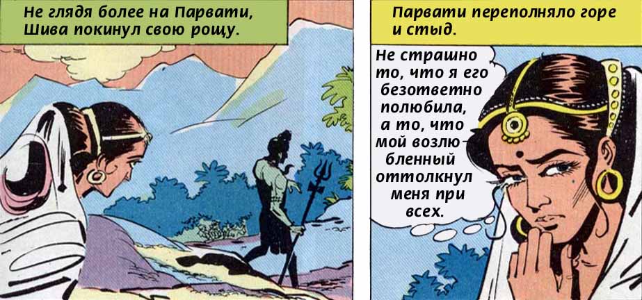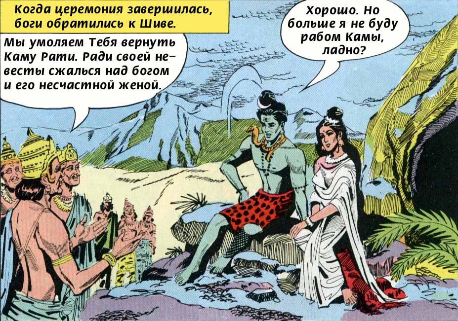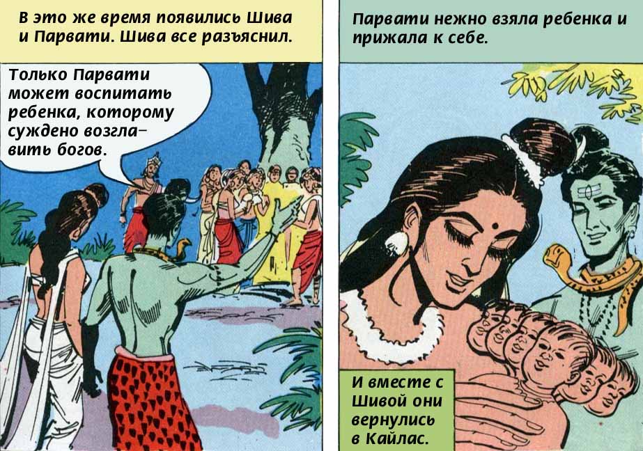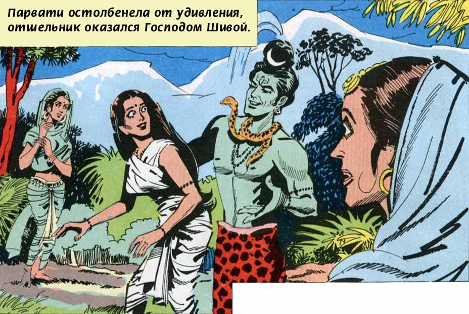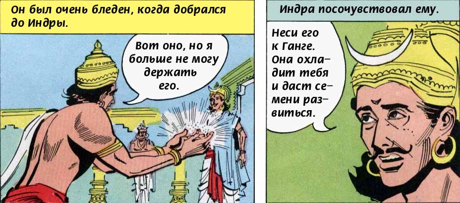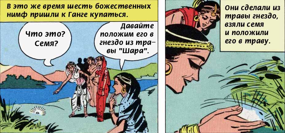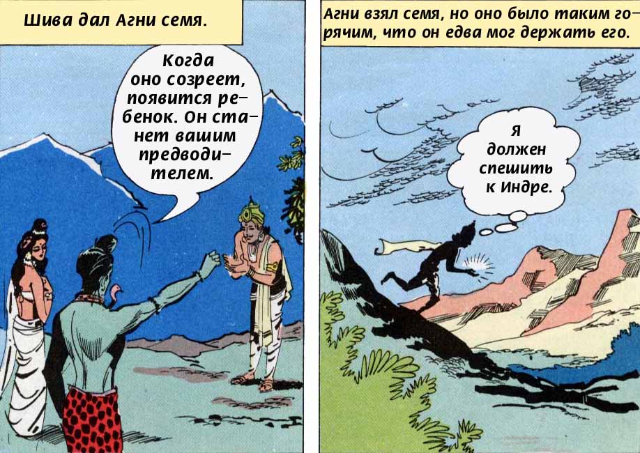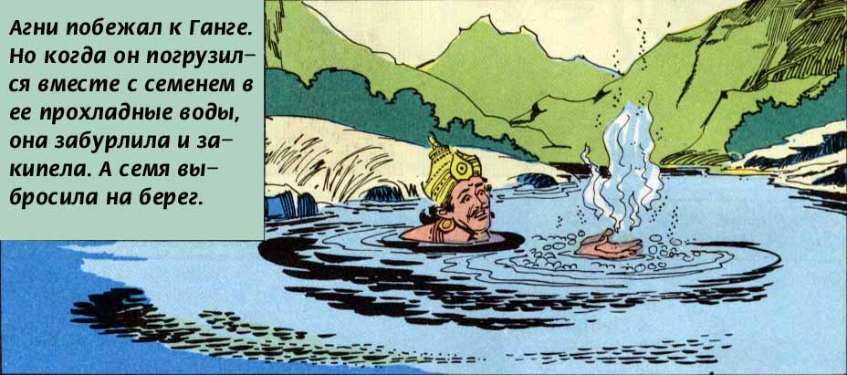 (Здесь есть некоторый юмор в повествовании: дело в том, что именно Агни является богом огня и жара. И то, что ему невыносимо горячо держать семя Шивы, должно означать вторичность всех полубогов и стихий по отношению к Единому Богу.)