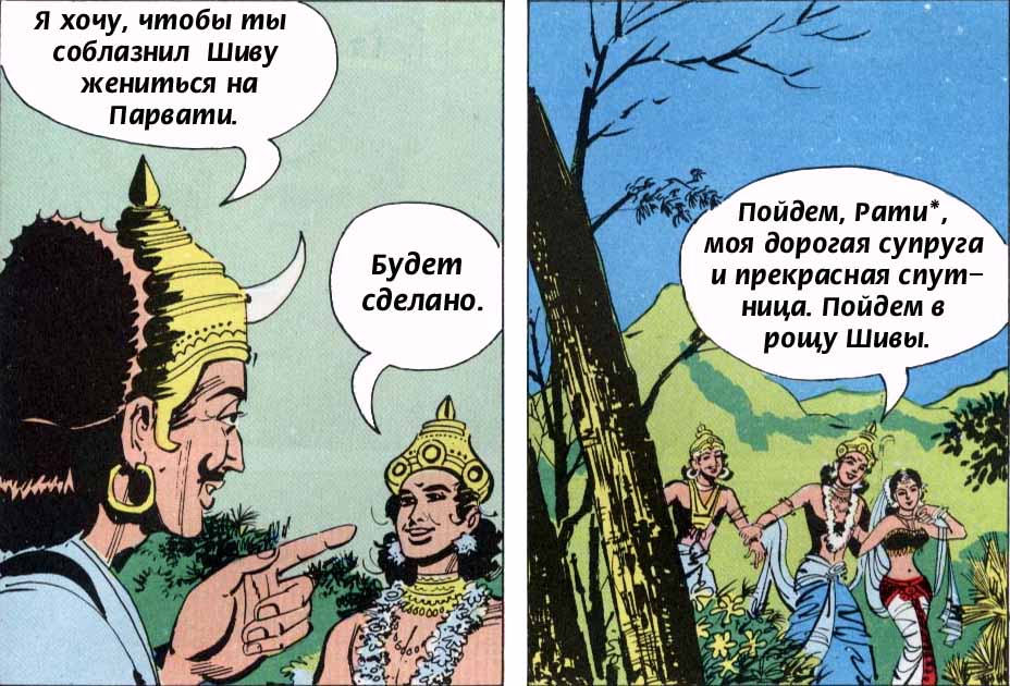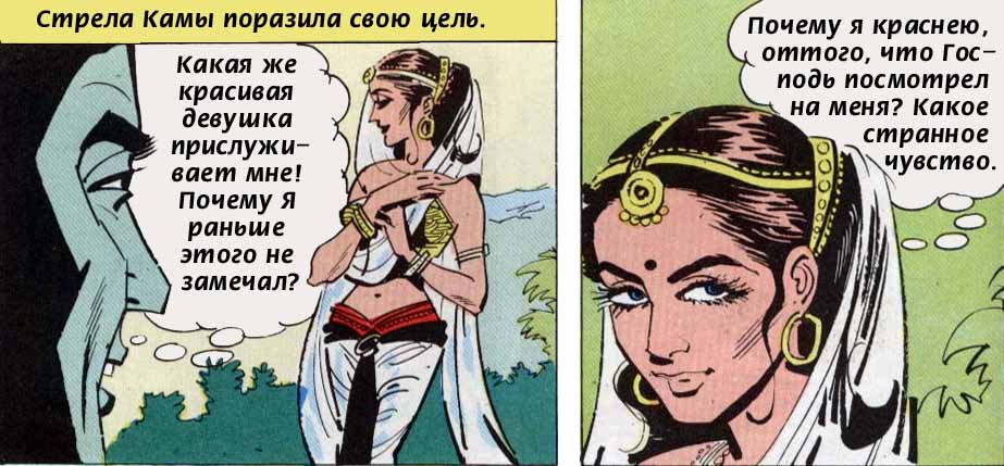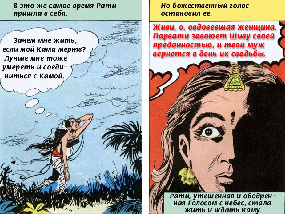 *) Рати - страсть, богиня страсти. Считается супругой Камы, бога плотской любви. Слово "кама" также означает "вожделение". Кама - это точный аналог Амура (Купидона), он тоже имеет лук и стрелы, чтобы поражать своих жертв.