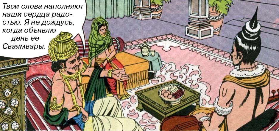 О сваямваре рассказывалось в книге комиксов "Кришна", в комиксе "Кришна и Рукмини". Царь принадлежит к касте кшатриев. Сваямварой называется кшатрийский брак, когда невеста сама выбирает себе жениха. Во многих сказках, где рассказывается, как царь (а цари относятся к касте кшатриев) собрался выдать дочь замуж, и пригласил женихов на состязание, описывается, фактически, сваямвара.