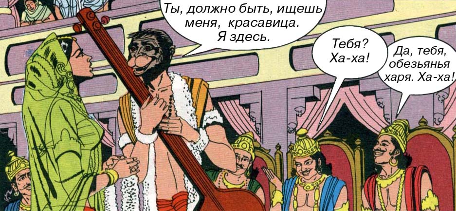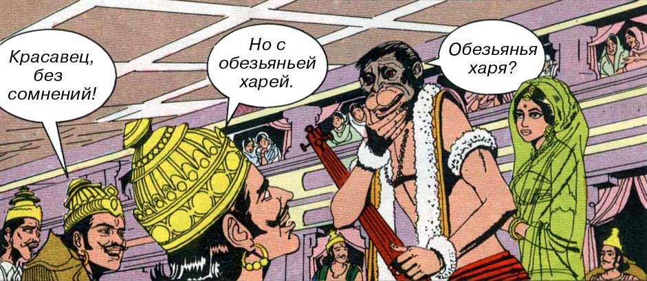 В русском языке есть слово "харя". Не исключено, что оно происходит именно от этого санскритского слова, обозначающего обезьянью морду (во всяком случае, очень на него похоже). При переводе, мы сочли возможным воспользоваться этим обстоятельством и использовали просторечное грубое слово "харя" для того, чтобы перевод был более художественным и разговорным.