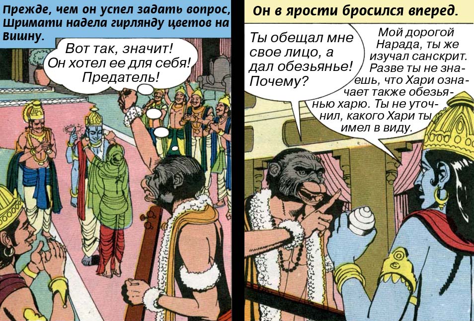 *) Хари является синонимом привлекательности и высшим ее пределом. Указывая на чью-то привлекательность, часто говорят - "привлекателен, как Хари". Что, конечно, является комплиментом. Никто не привлекателен, как Хари. Отсюда ясен смысл просьбы Нарады. Он просит Бога, сделать его лицо неотразимо привлекательным, "как лицо Хари".