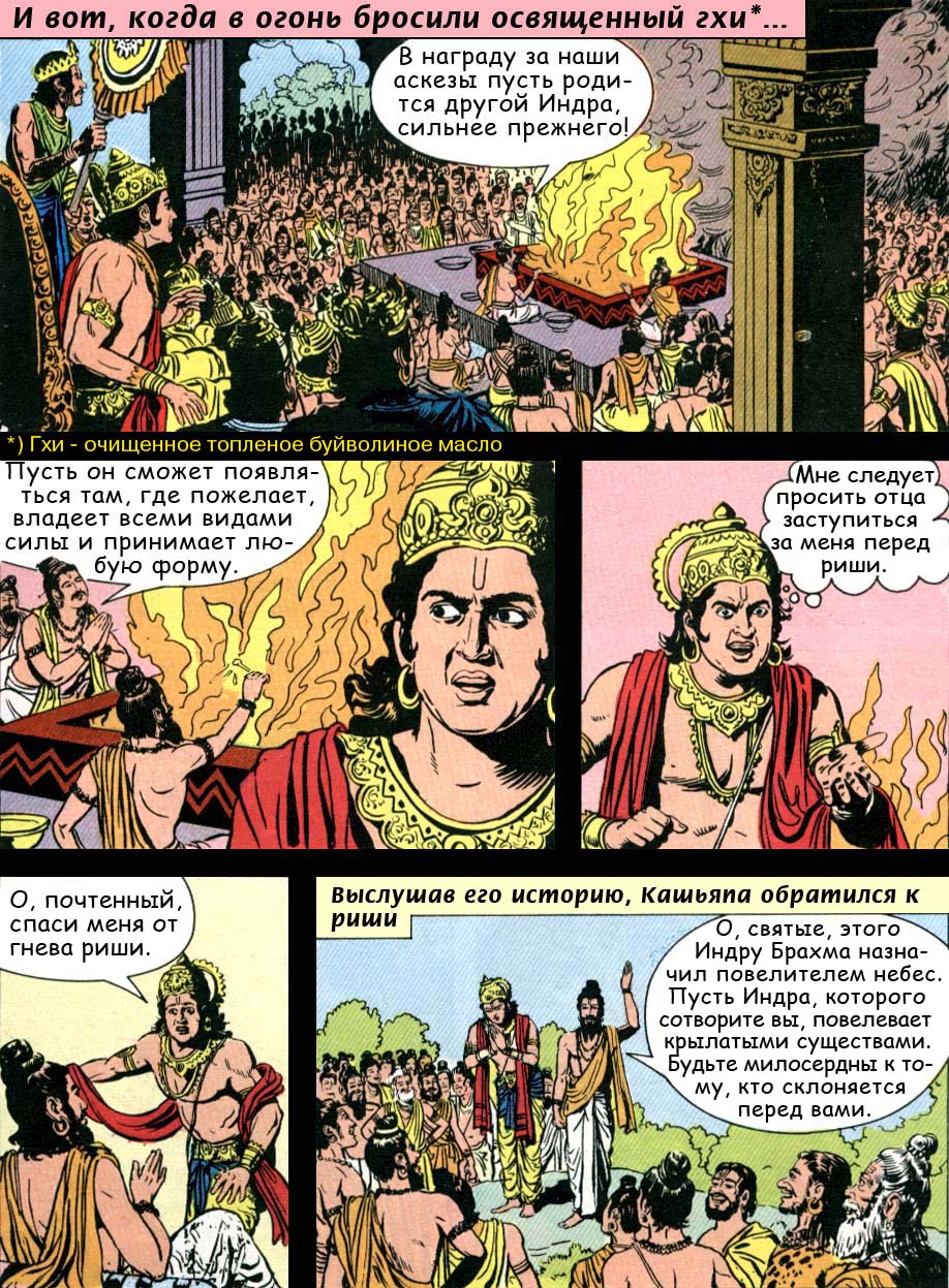 Услышав эту торжественную клятву, царь богов, свершитель ста жертвоприношений, был крайне встревожен и тотчас же направился к неуклонному в исполнении обетов Кашьяпе. Поговорив с небесным царем, Кашьяпа подошел к валакхильям и осведомился, успешно ли протекает их подвижничество. Честные валакхильи ответили: