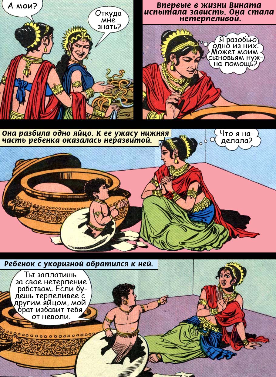 Через некоторое время, о старший из брахманов, Кадру снесла тысячу яиц, а Вината - всего два. Обрадованные слуги уложили яйца во влажные сосуды, где они пролежали пятьсот лет. По прошествии этого времени сыновья Кадру вылупились из яиц, но оба сына Винаты так и не появлялись на свет. Эта благочестивая, сурового поведения женщина, которой очень хотелось иметь детей, испытывала сильный стыд. Вскрыв одно яйцо, Вината увидела в нем своего сына. Люди сведущие утверждают, что верхняя половина его тела была полностью развита, но нижняя отставала в своем развитии.