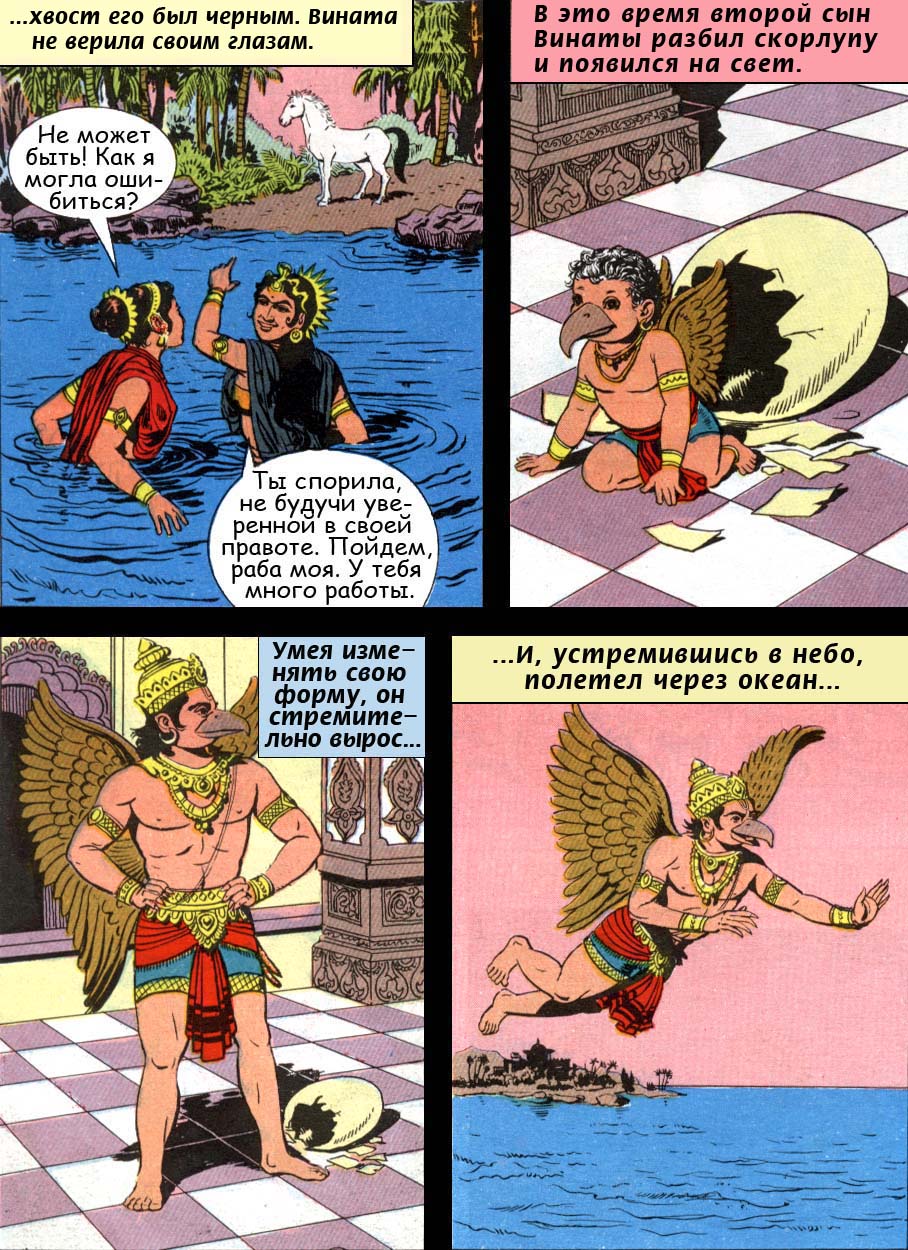 Затем Гаруда, царь птиц, полный великой энергии и мощи, который мог летать, куда пожелает, перелетел на дальний берег великого океана и приблизился к своей матери. Проиграв спор и став простой служанкой, Вината испытывала мучительное горе.