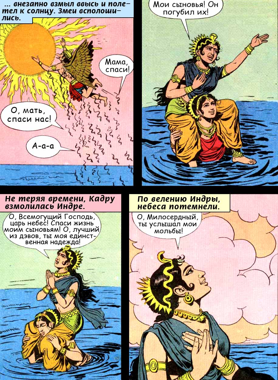 Вината отнесла на остров свою сетсру Кадру, а Гаруда по просьбе матери перенес всех змей. Когда летающий сын Винаты взмыл ввысь, к самому солнцу, змеи под нестерпимо палящими лучами впали в бесчувствие. Видя, что ее дети в опасности, Кадру принялась молиться Господу Индре: "Почтительно склоняюсь перед тобой, о владыка полубогов, склоняюсь перед тобой, о сокрушитель целых армий! Склоняюсь перед тобой, о победитель Намучи, о тысячеокий муж Сачи. Пусть хлынут твои воды и спасут змей, припекаемых пылающими солнцем. Только ты можешь спасти нас от всех опасностей, о лучший из бессмертных!