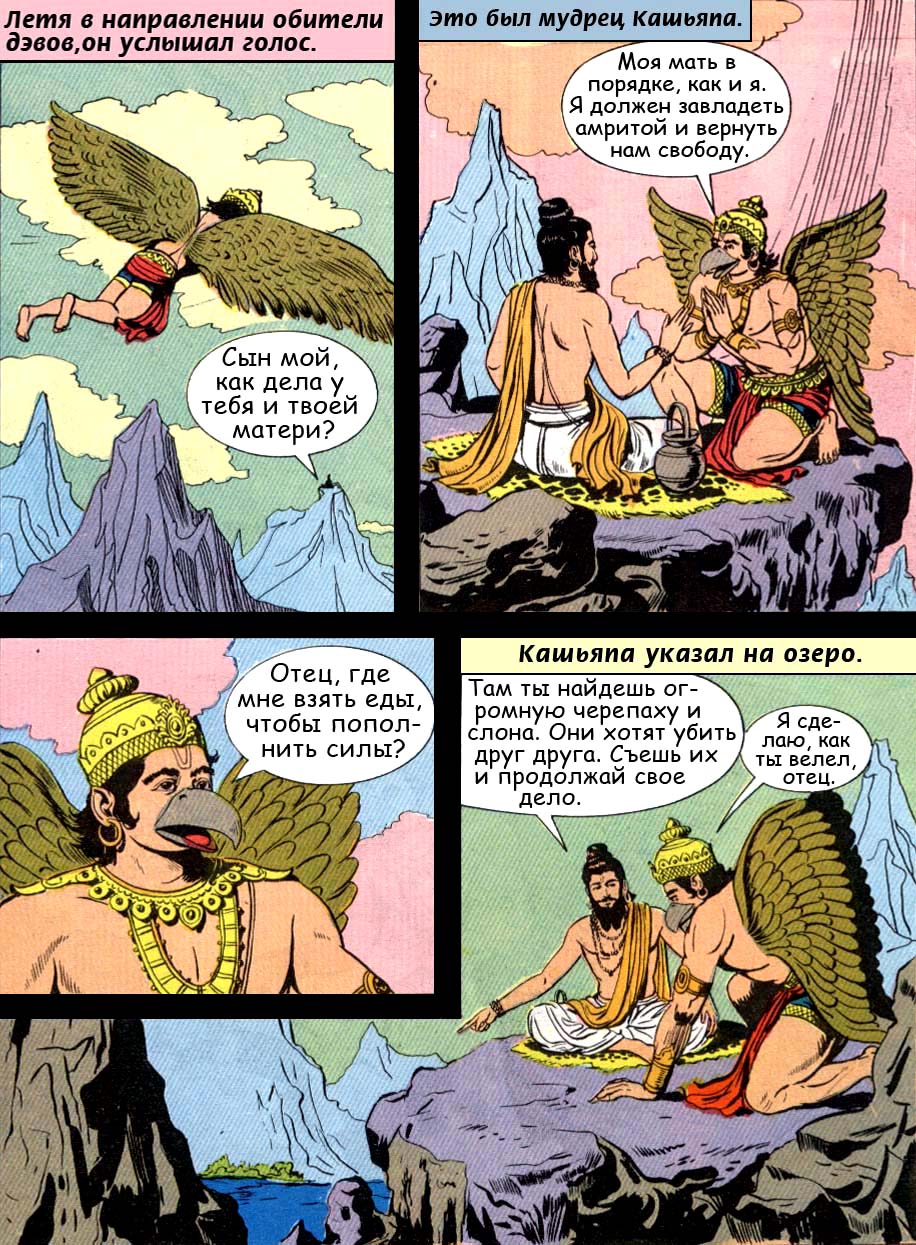 Наконец Гаруда подлетел к лучшей из гор, несокрушимой Гардхамадане. Там он увидел своего отца Кашьяпу, занятого суровым подвижничеством. И Кашьяпа тоже увидел своего крылатого сына, сверкавшего божественной красотой; полный героической отваги и силы, Гаруда двигался с быстротой мысли и силой [ураганного] ветра; величиной он походил на большую горную вершину; голову держал прямо, как Брахма свой жезл; всем существам он казался непостижимым, недоступным и ужасным; он был наделен мистической силой, отличался такой же беспощадностью, как огонь; и не только не мог быть побежден богами или демонами, но даже не страшился их угроз; ко всему еще ударами своих урыльев он мог сносить горные вершины, мог осушать реки, а от его ужасающего, как лик смерти, взгляда трепетали целые миры.