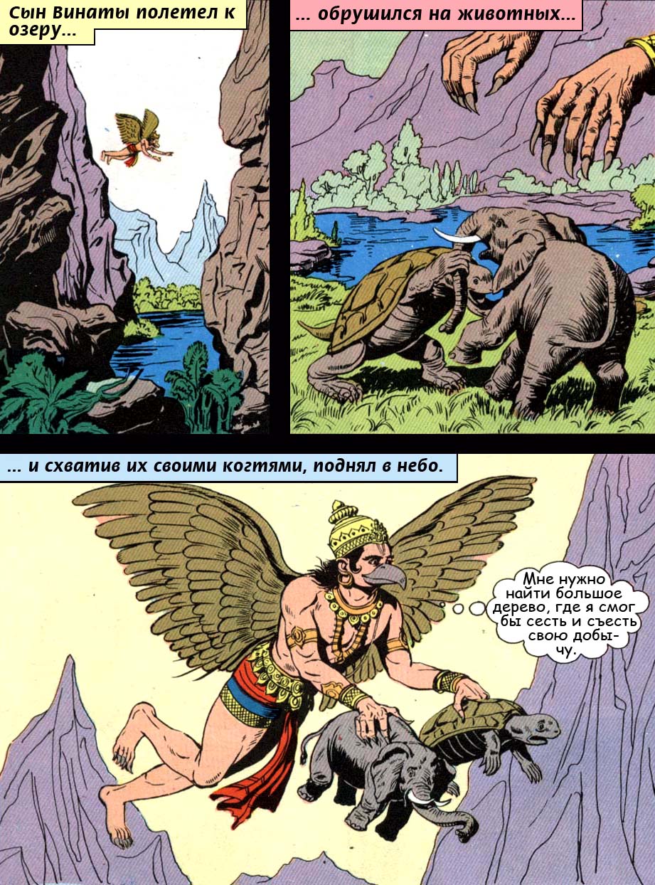 Услышав слова отца, эта невероятно могучая птица, блуждающая в небесном пространстве, одной лапой схватила слона, а другой черепаху и, крепко их держа, вознеслась высоко в небо.
