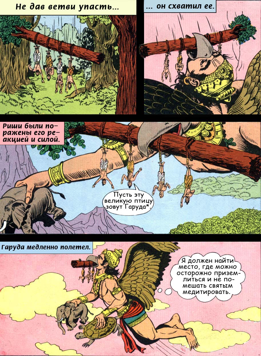 Как только Гаруда опустился обеими своими лапами на этот прочнейший сук, он тут же сломался, но Гаруда не разжал когтей; с улыбкой глядя на громадный переломленный сук, он заметил, что под ним, головой вниз, висят небесные валакхильи. Опасаясь причинить им вред, он нагнулся и схватил сук клювом. Стремясь посадить маленьких мудрецов на землю, озабоченный Гаруда летел как можно тише, но всякий раз, когда он пытался сесть в этом гористом краю, горы под ним разламывались. Движимый состраданием к валакхильям, Гаруда облетел много земель, все еще держа слона и черепаху, но так и не нашел подходящего места для приземления.