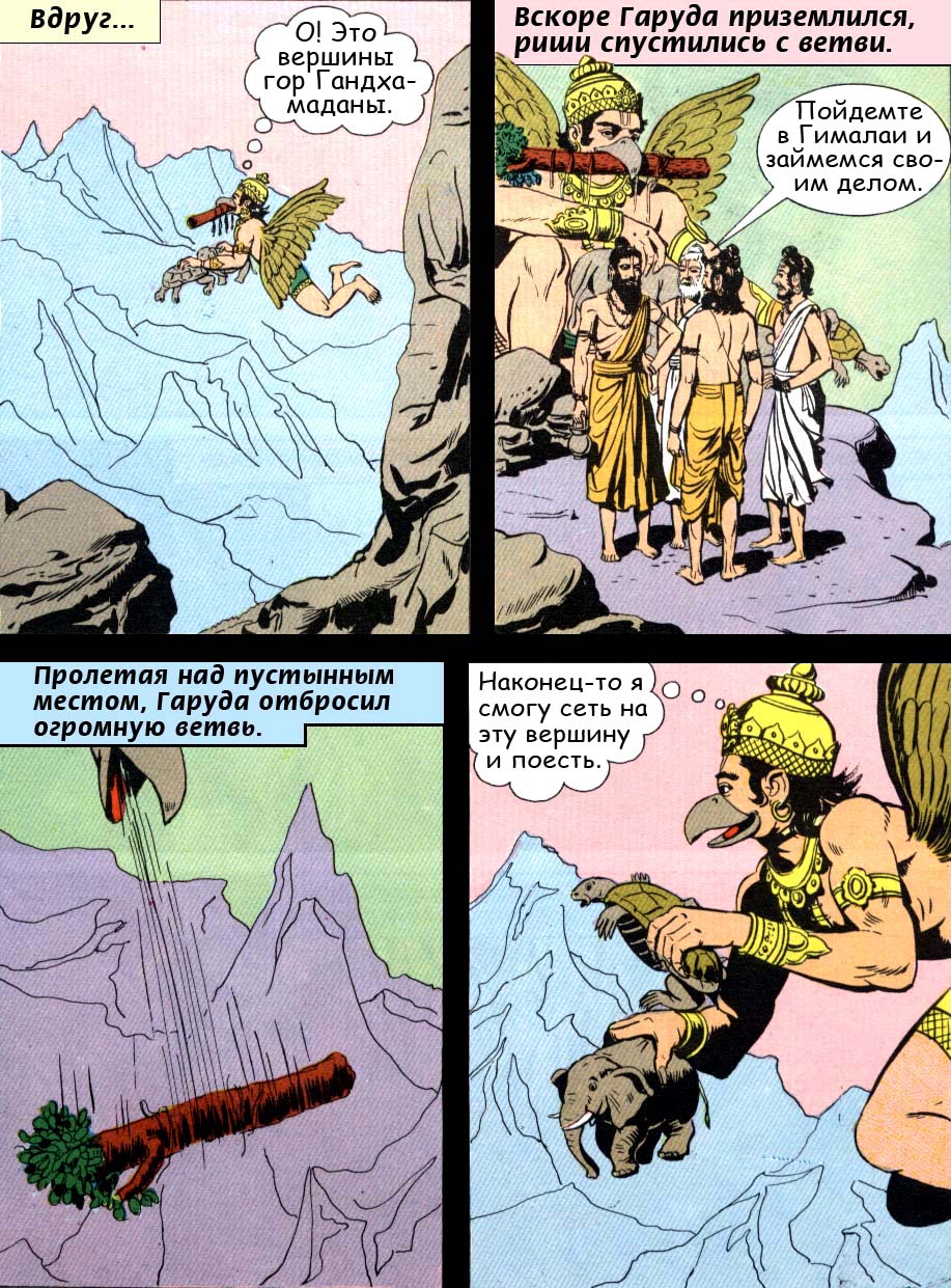 И тогда Кашьяпа рассказал ему о необитаемой горе, долины и пещеры которой доверху завалены снегом, горе, куда другие живые существа не могут попасть даже в своем воображении. Гаруда сперва мысленно побывал в тех горных краях, затем стремительно полетел туда с суком, слоном и черепахой. Даже длинный тонкий ремень, вырезанный из сотни шкур, не мог бы обхватить могучий сук, который нес Гаруда. Казалось, всего за один миг Гаруда, этот лучший из всех летающих, преодолел расстояние в 80000 йоджан. Достигнув описанной отцом горы, он отпустил громадный сук, с грохотом рухнувший наземь.