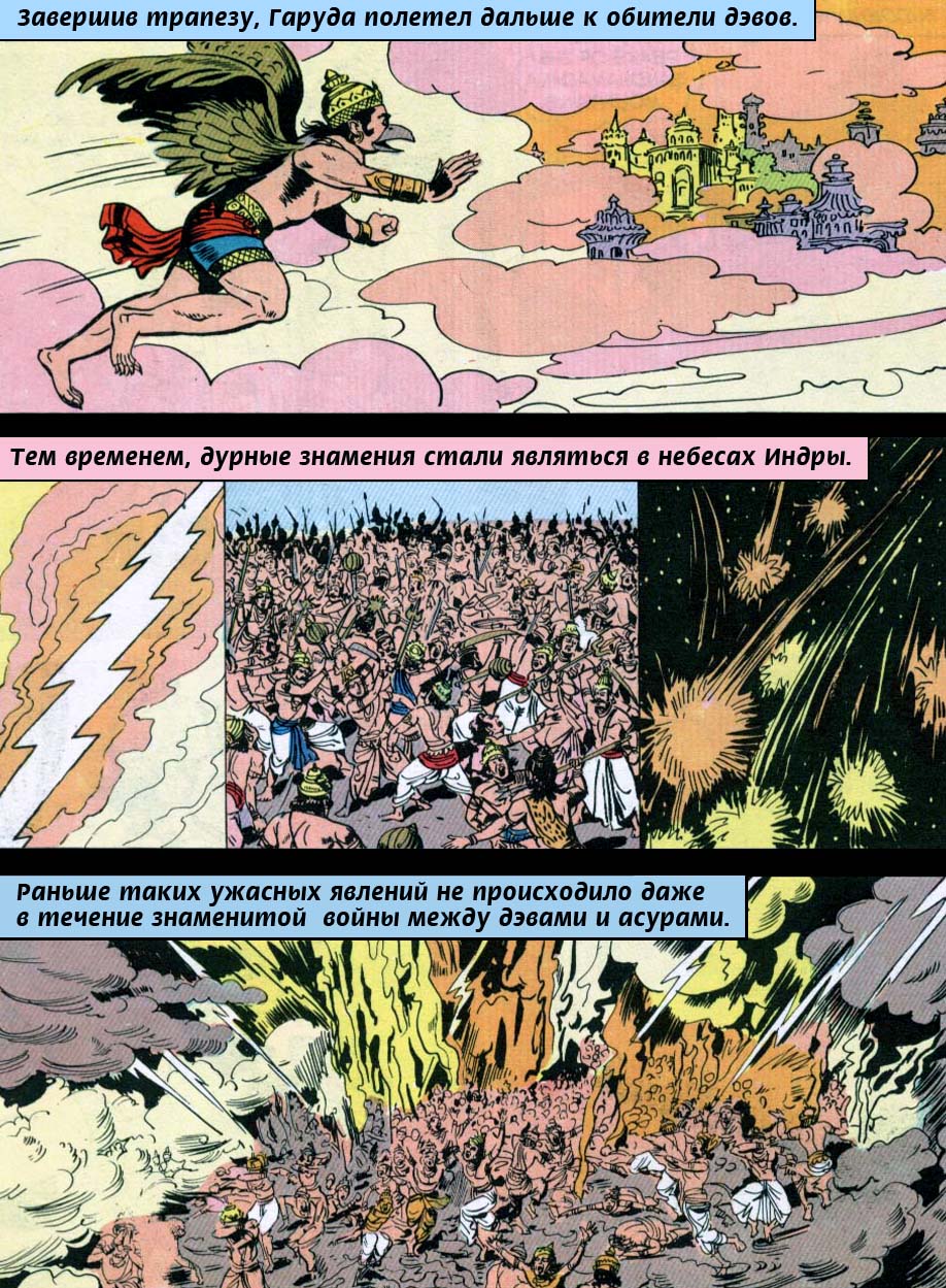 Стоя на горной вершине, лучший из всех летающих Гаруда сожрал и слона и черепаху, а затем с быстротой мысли снова взлетел ввысь. В этот миг зловещие знамения возвестили опасность для полубогов. Было потревожено и блеснуло, как бы в мучительной боли любимейшее оружие Индры - молния. Среди бела дня, в дыму и пламени, с неба посыпались метеоры. Личное оружие Васу, рудр, адитьев, садхьев, марутов и других богов начало сражаться друг с другом. Этого до сих пор еще никогда не случалось, даже в великих войнах меж богами и демонами. Могучие вихри обрушивались на мир, повсюду падали метеоры.