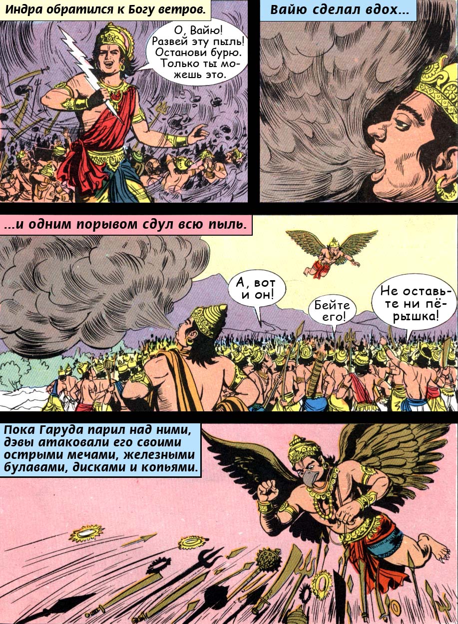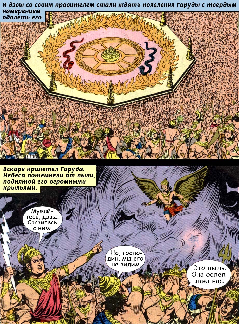 Могучий ветер тотчас же разогнал пыль, и как только мрак рассеялся, боги насели со всех сторон на Гаруду. Но не дрогнув перед этим мощным нападением, он издал оглушительный рев, подобный небесному грому, вселяя страх в сердца всех сущих. Царь птиц, истребитель могучих врагов, взмыл высоко ввысь и реял над богами, как воплощение силы. Облаченные в доспехи небожители пустили в ход всевозможные виды оружия: копья, железные булавы, трезубцы, палицы и пылающие, словно маленькие солнца, остро заточенные диски. Но царь птиц, казалось, был неодолим, он с дикой яростью отражал все нападения. Пылая огненным гневом, сын Винаты ревел в небе и, спускаясь вниз, крушил богов крыльями и грудью.