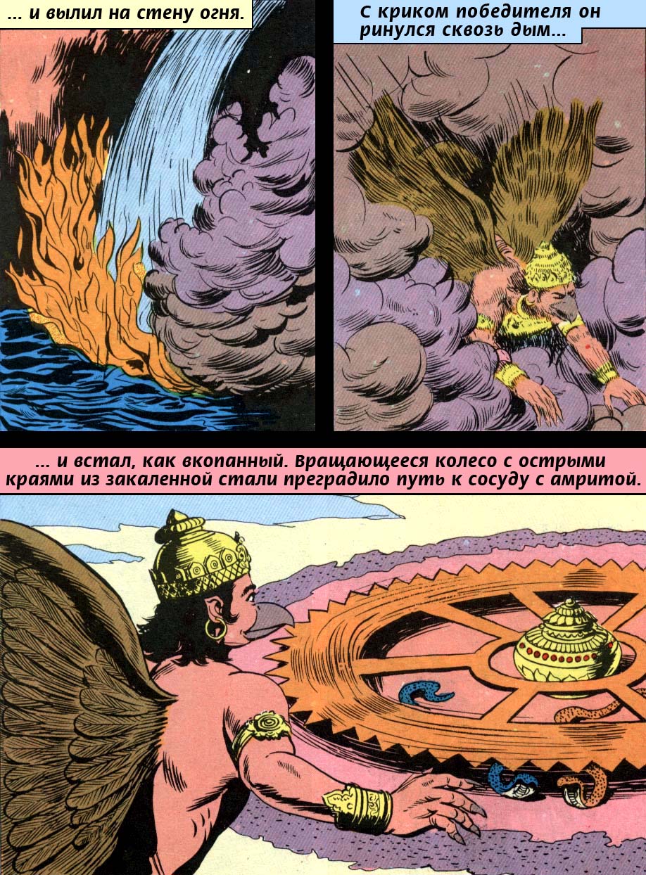 Расправившись с этими великими воинами, лучший из летающих перешагнул через них, намереваясь похитить нектар, но увидел, что его со всех сторон окружает море огня, раздуваемого резкими порывами ужасного ветра. Огонь простирался так высоко, что, казалось, сжигал сами небеса. Великий духом Гаруда тотчас же вооружился девяносто раз по девяносто клювами, этими клювами очень быстро выпил много рек, а затем ринулся в гущу огня. Сбивая пламя своими крыльями, заливая его речными водами, истребитель врагов погасил пылающий пожар, после чего уменьшил свое тело до самых крошечных размеров. Ибо теперь потушив пожар, Гаруда хотел проникнуть в хранилище небесного нектара.
