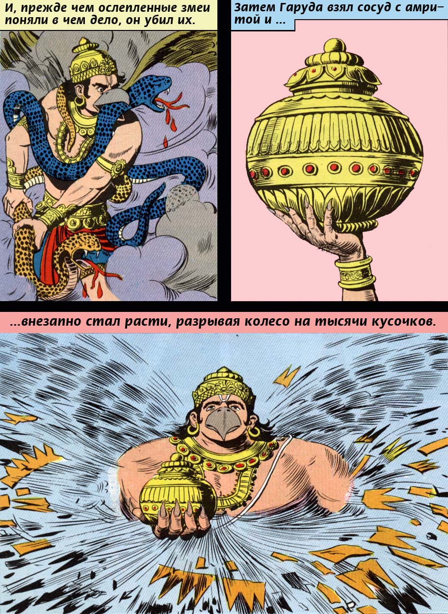 Как речные воды пробивают себе путь к морю, так и Гаруда, чье золотое тело светилось, словно солнце или луна, проник в хорошо охраняемое святилище, где хранился нектар. Здесь он увидел непрерывно вращающееся железное колесо, снабженное острыми, как бритва, лезвиями. Это раскаленное, как солнце, чрезвычайно опасное и ужасное устройство было сооружено богами, для того чтобы рассечь на куски всякого, кто попытается похитить нектар. Но великая птица сразу же сообразила, как ей проникнуть сквозь колесо: уменьшившись до еще более крохотных размеров, она стала вращаться вместе с колесом, а затем вдруг скользнула меж его спицами. Но за колесом таились два чудовищно могучих змея, сверкающих, точно пылающее пламя; головы у них были огненные, глаза огненные, а языки походили на молнии. Эти змеи обладали способностью извергать смертельный яд своими глазами. А своими яростными неподвижными взглядами они могли спалить любого, кто посмел бы вторгнуться в святилище: несчастный тут же превратился бы в пепел.