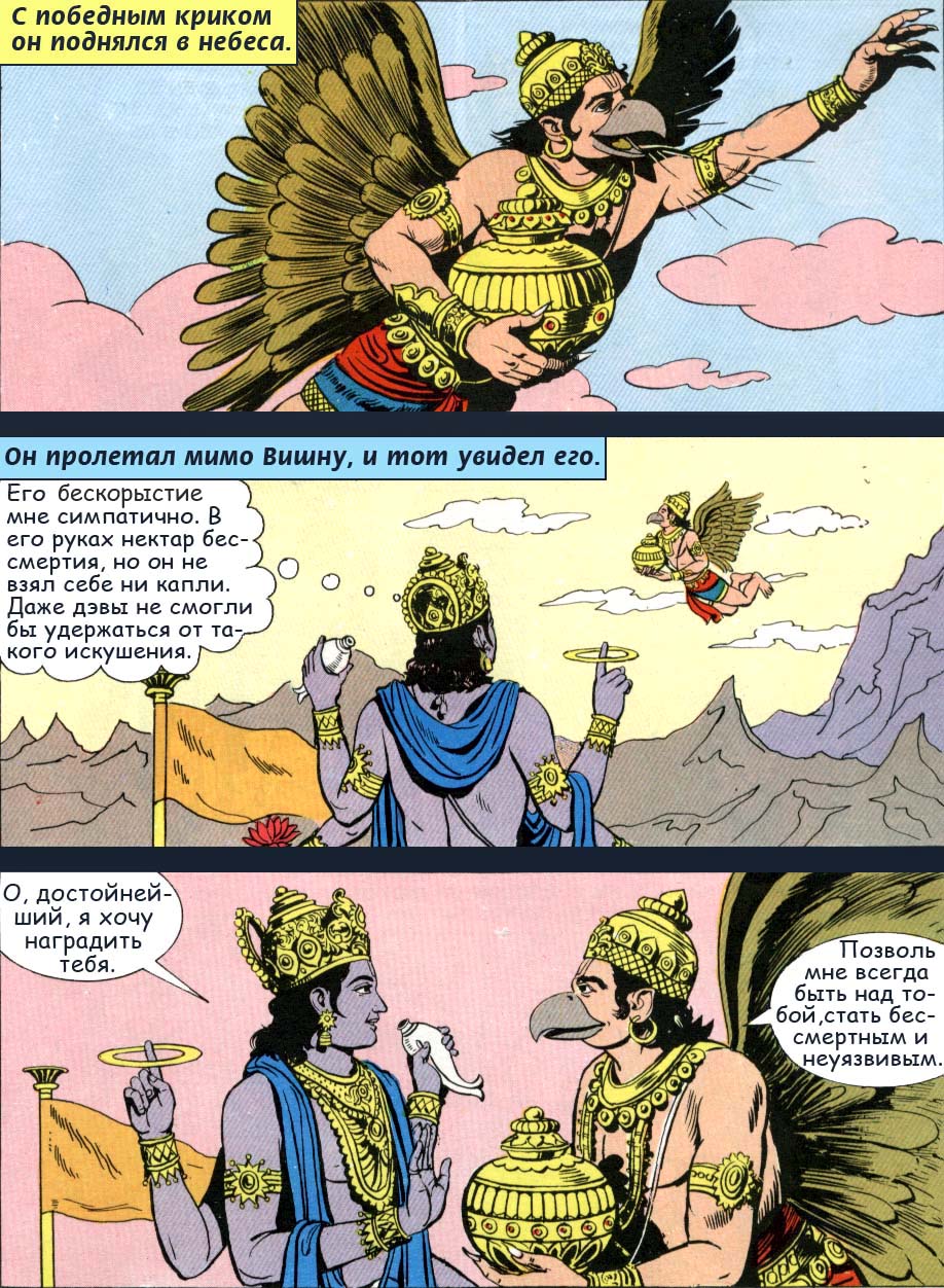 Пролетая по небесам, Гаруда неожиданно встретился с бессмертным Господом Вишну, довольным совершенным им редчайшим бескорыстным подвигом. [Ведь Гаруда добыл нектар не для себя.] Господь обещал великой птице: