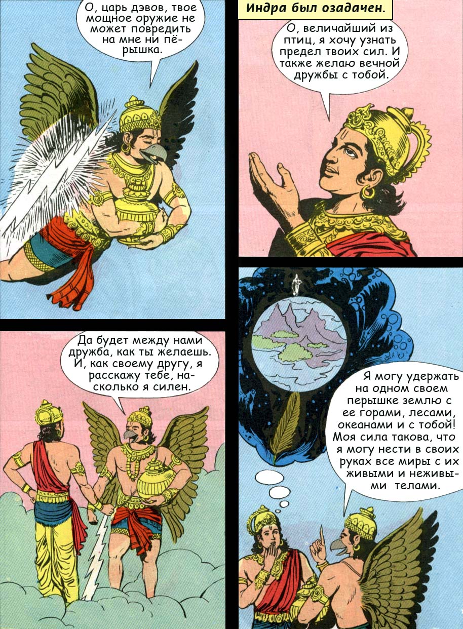 - О дорогой Господь Индра, да будет меж нами, как ты того желаешь, вечная дружба. Что до пределов моей силы, то знай, что мое могущество велико и необоримо. Но святые не одобряют восхваления собственной силы и превознесения собственных достоинств. Я отвечу на твой вопрос только потому, что отныне мы друзья, в противном случае я никогда бы не стал беспричинно восхвалять самого себя. Скажу только, что весь этот мир с его горами, лесами и морями, включая и тебя, Индра, мог бы висеть на стержне одного из моих перьев. Чтобы ты мог уяснить себе, сколь велика моя сила, скажу также, что если бы соединить все миры с их движущимися и неподвижными существами, я мог бы нести их, не чувствуя ни малейшей усталости.