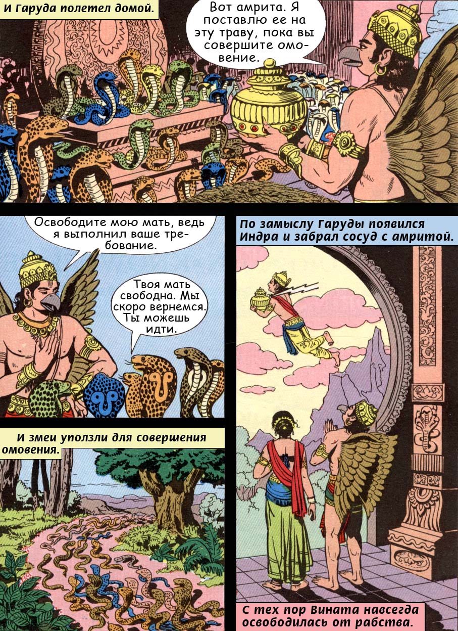- Да будет так, - ответили змеи Гаруде и отправились свершать омовение, тем временем Господь Индра схватил нектар и возвратился с ним в свое небесное царство.