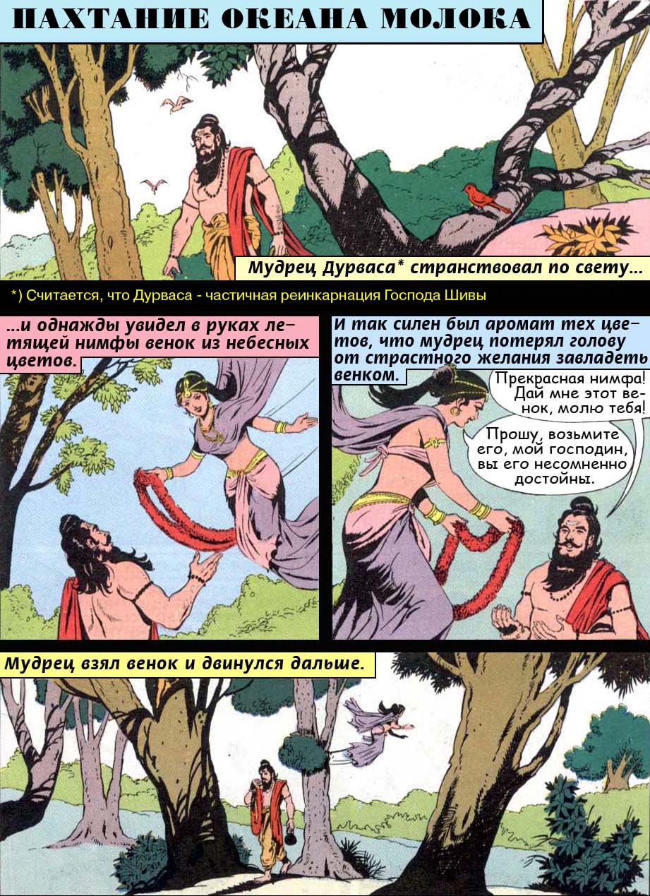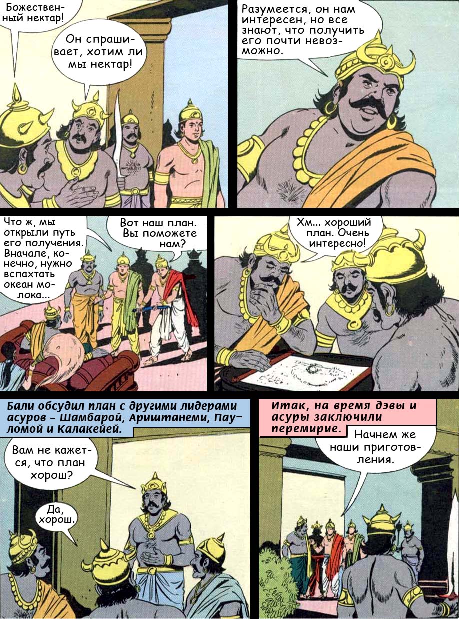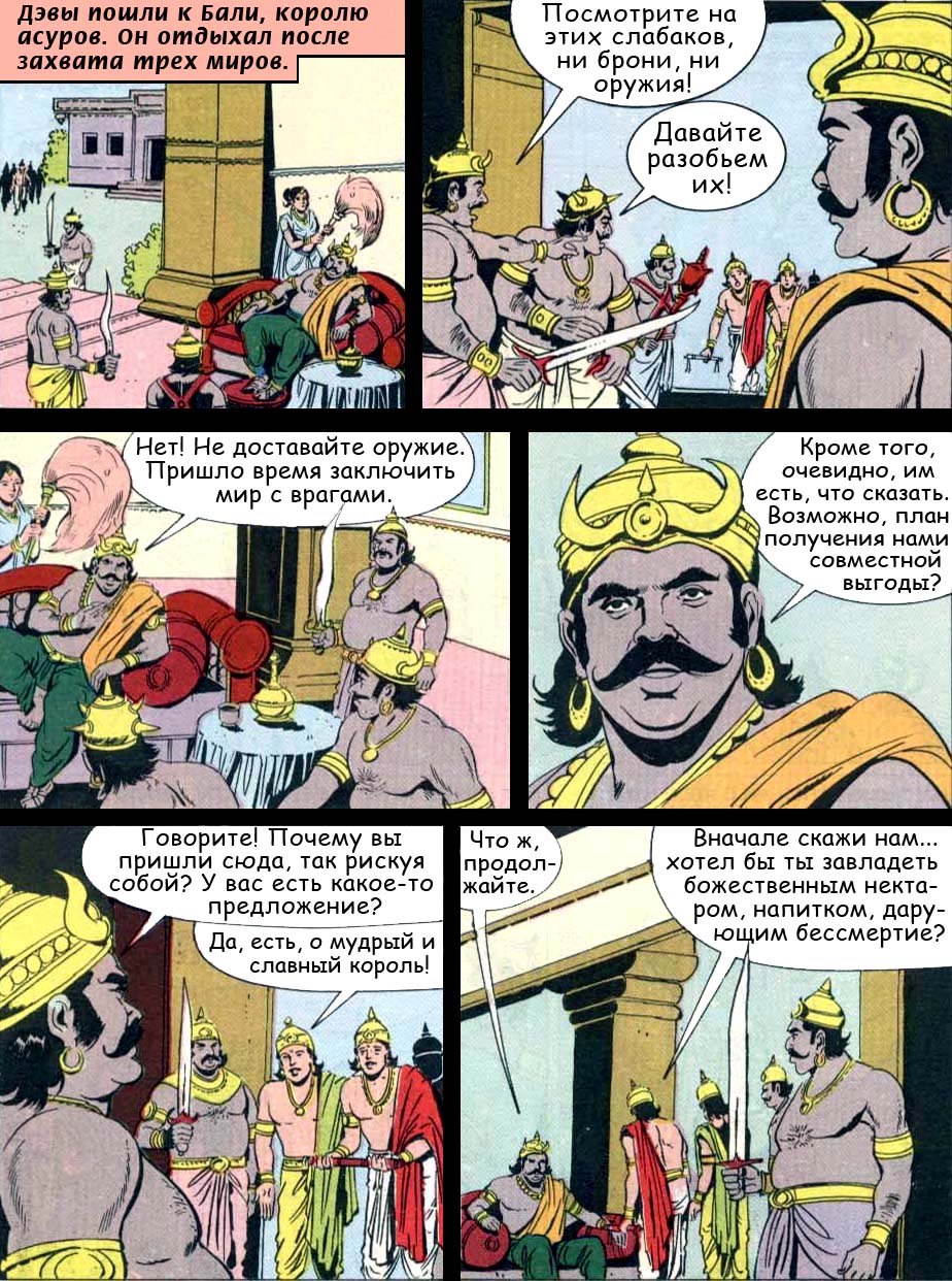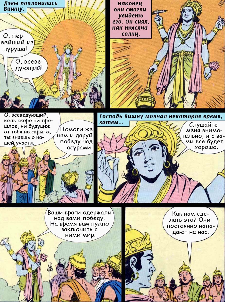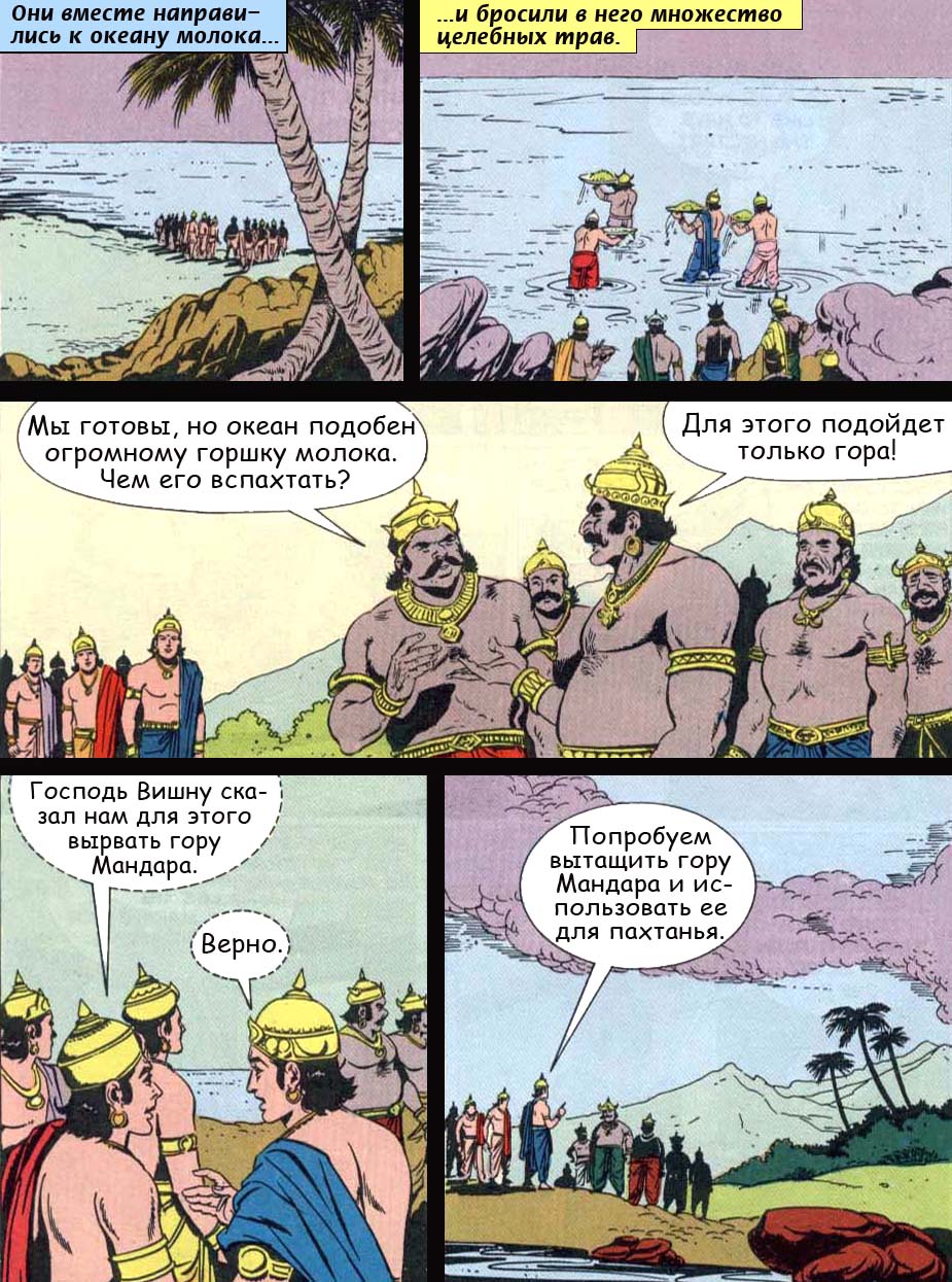 - Полубоги и демоны должны соединить свои силы в пахтании океана, ибо только таким путем можно добыть нектар бессмертия. Взбивайте же океан, о боги, и вы непременно добудете все целительные травы и всевозможные дорогие каменья, а в конце концов и нектар бессмертия.