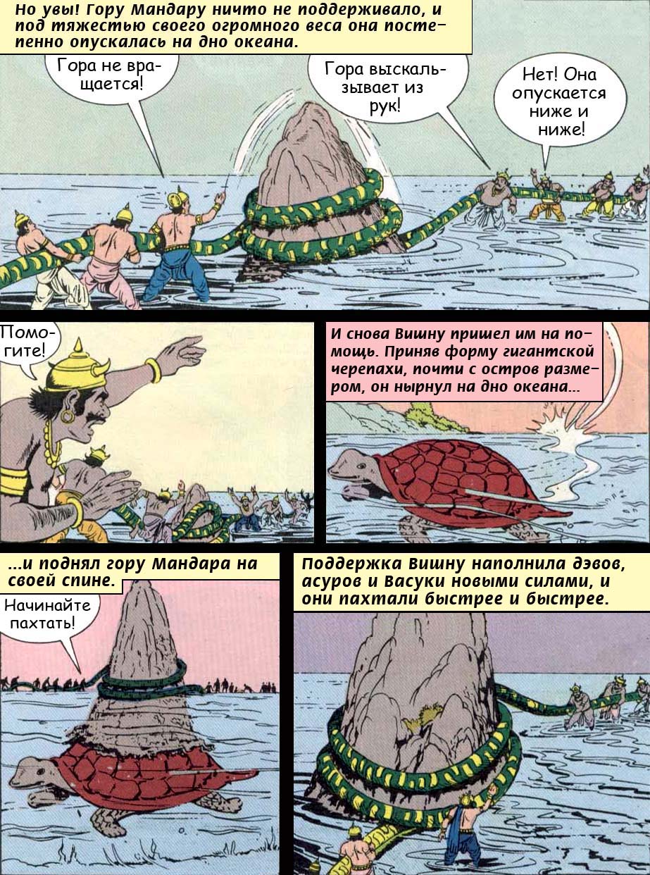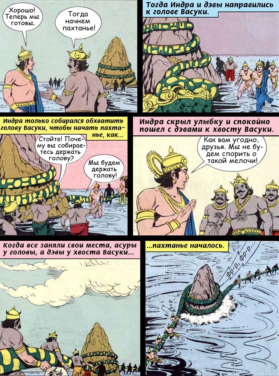 Царь черепах согласился и не споря подставил свою могучую спину. Господь Индра особым орудием сплющил вершину горы, придав ей форму мутовки, и используя небесного змея Васуки как веревку, боги принялись взбивать обширнейшие воды океана. Даитьи и данавы также хотели испить нектара, о брахман, и они тоже приняли участие в пахтании. Могучие демоны ухватились за один конец Васуки, царя змеев, тогда как полубоги сообща взялись за его хвост.