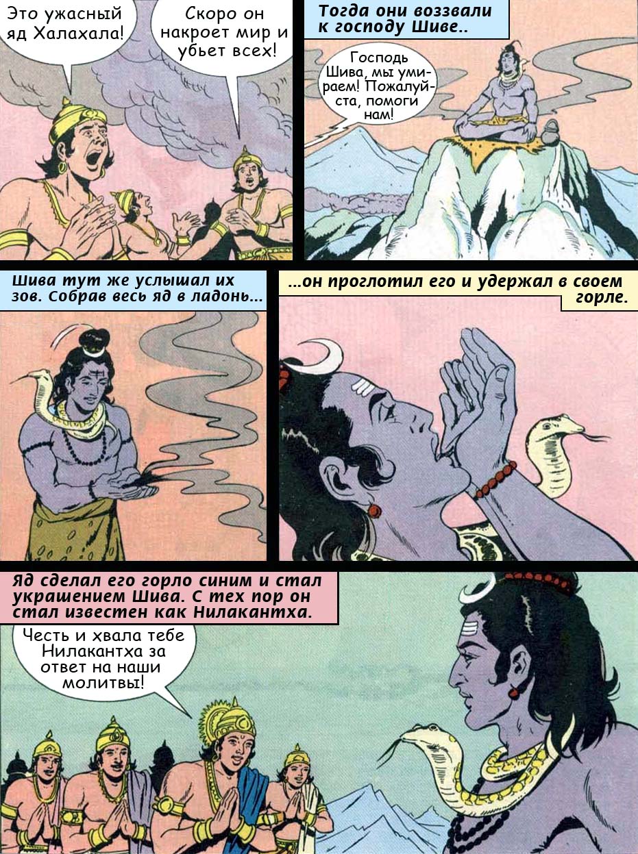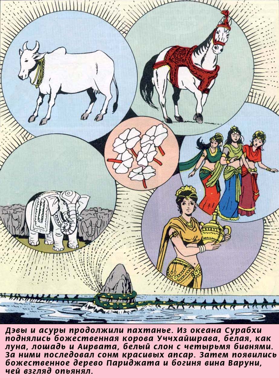 В то время как боги и демоны продолжали взбивать океан горой Мандарой, из его водных недр начал доноситься громкий рокот, похожий на могучие раскаты небесного грома. Под ударами огромной горы в соленом море гибли многие сотни различных водяных существ. Громадная Мандара беспощадно уничтожала обитателей космических глубин, покорных власти бога Варуны. Во время ее вращения большие деревья, где обитали многочисленные птицы, раскачиваясь, ударялись друг о друга и низвергались с вершин. Трение друг о друга падающих деревьев порождало огонь, языки которого быстро охватывали всю Мандару, подобно тому, как вспышки молний окружают синеватые дождевые тучи. Пожар спалял даже могучих слонов и львов, тщетно пытавшихся спастись бегством. В его полыхании гибли всевозможные смертные существа. Наконец лучший из полубогов Господь Индра погасил этот пожар своими ливнями. Травяные соки и древесные смолы в большом обилии стекли с горы Мандары в океан. От млека этих соков, наделенных жизнетворностью нектара, и потока расплавленного золота боги и должны были обрести свое бессмертие. И вот теперь, смешавшись с лучшими соками, океанская вода превратилась в молоко, а взбитое молоко превратилось в масло.