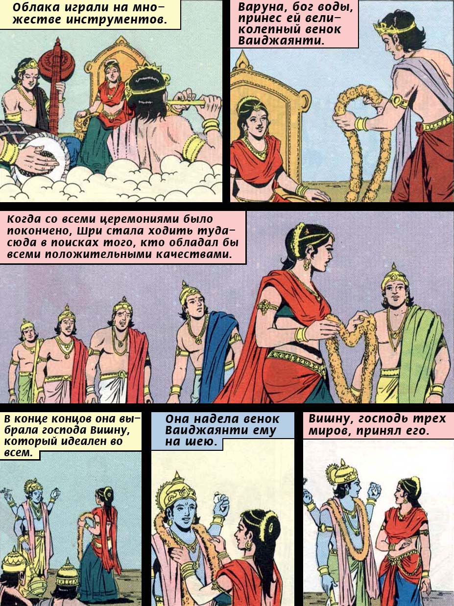 Вслед за ней, в своем белом одеянии, из очищенного масла появилась богиня процветания, за ней - богиня вина, а за ней - быстроногий белый скакун. А затем из нектара, великолепный и ярко сверкающий, появился драгоценный божественный камень Каустубха, предназначенный для того, чтобы украсить собой грудь Господа Нараяны. Богиня процветания, богиня вина, луна и быстрый, как мысль, скакун - все направились солнечной тропой к тому месту, где находились боги.