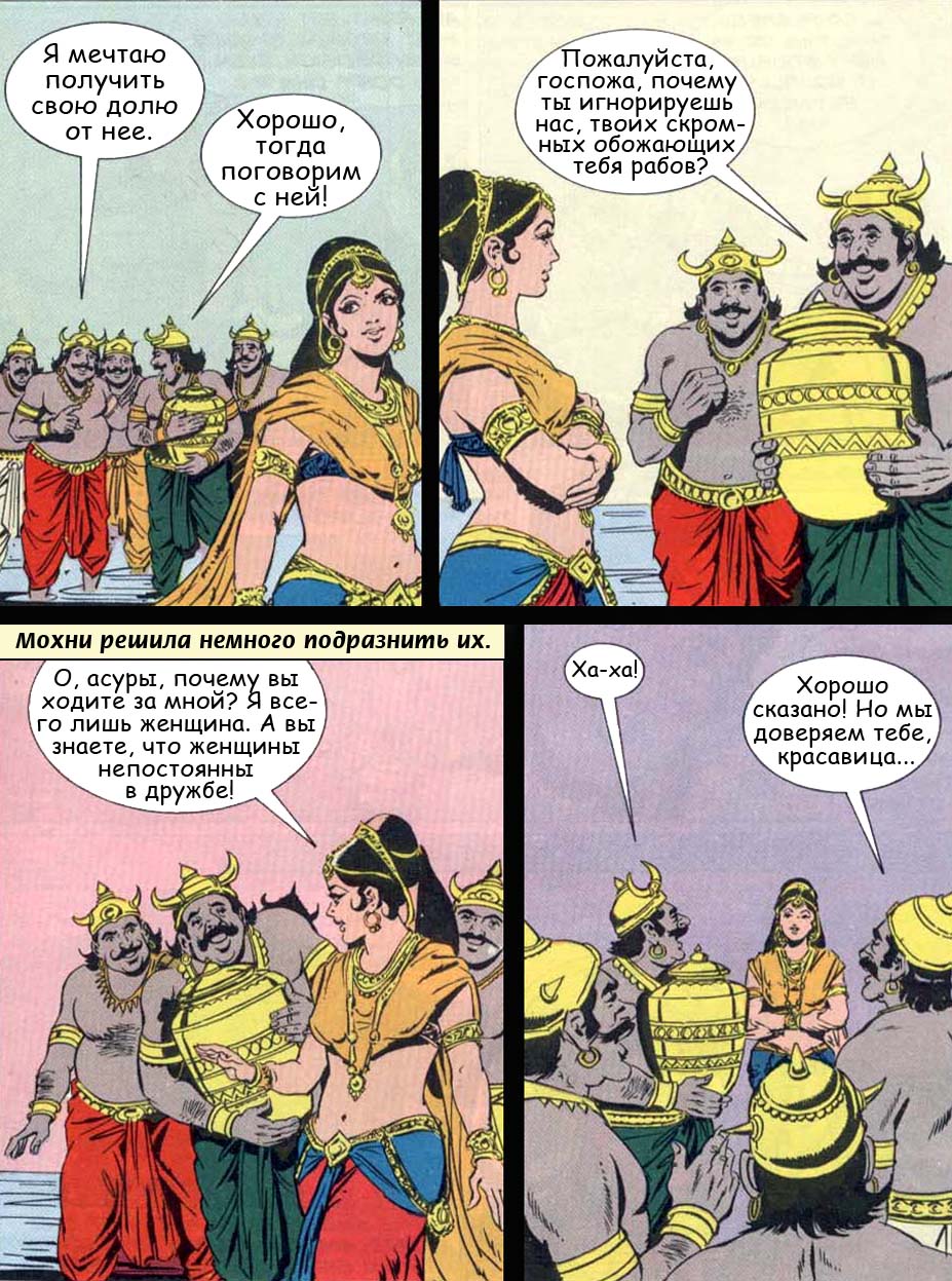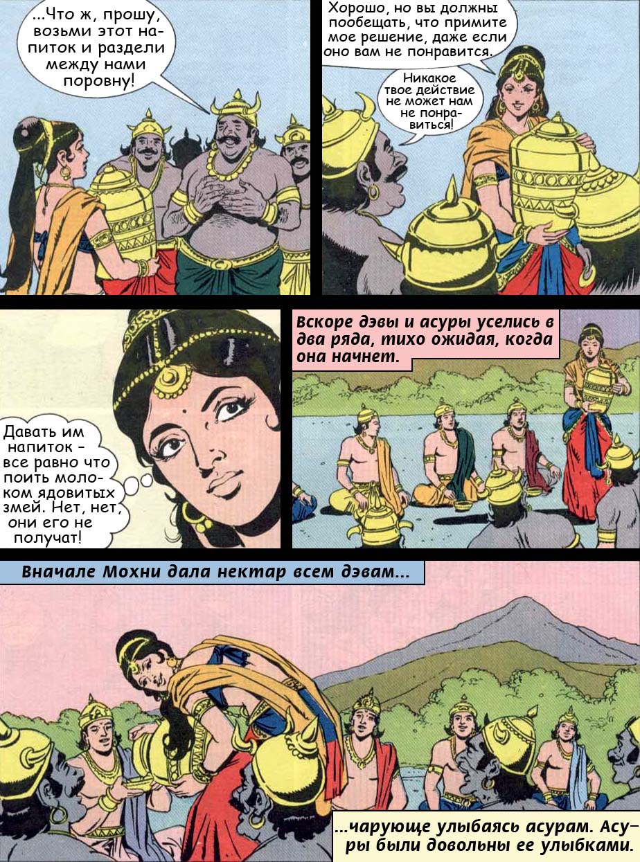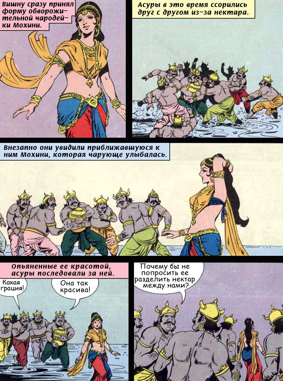 - Мой нектар!Мой! - наперебой кричали они, но Господь Нараяна, явив Свое мистическое могущество, принял образ поразительно красивой женщины и решительно вошел в толпу демонов. В этом чарующем женском воплощении, Мохини-мурти, Он наслал морок на демонов, и все даитьи и данавы, завороженные, без колебаний отдали Ему нектар.
