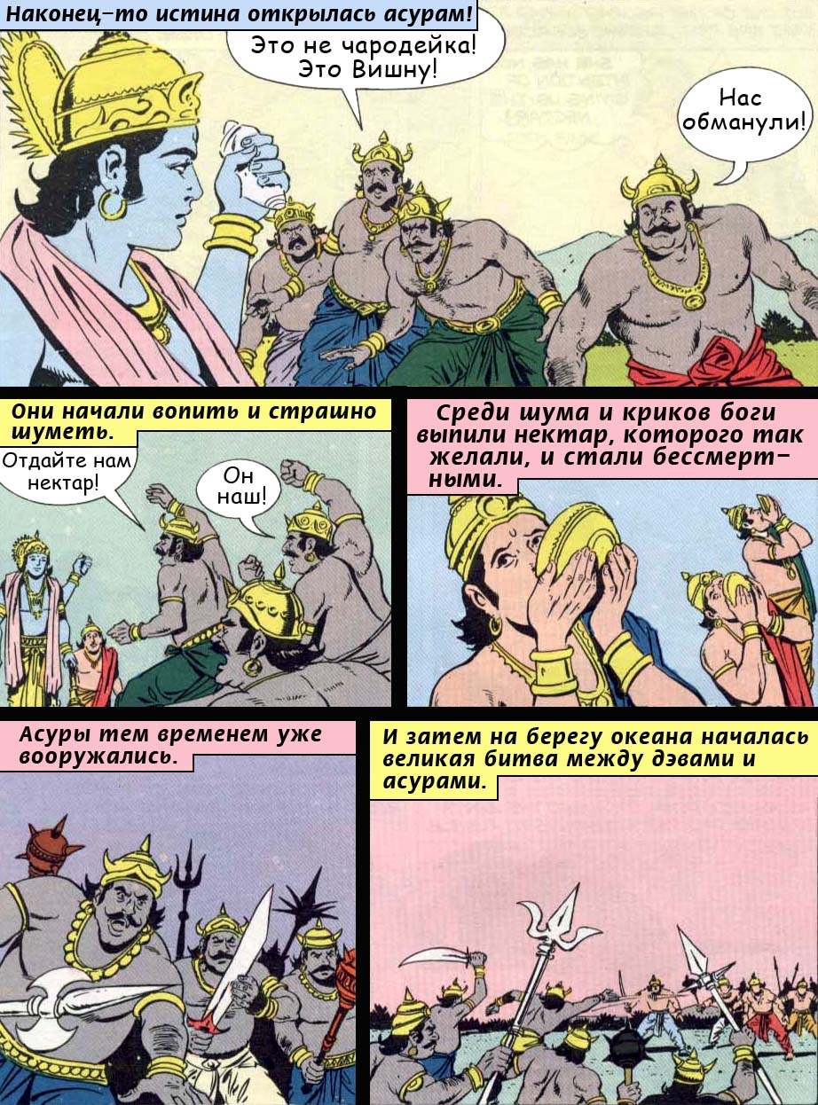 [Поняв, что их ловко провели], объединившиеся даитьи и данавы, схватили свои прочнейшие щиты и различное оружие и ринулись на полубогов. Но всемогущий глава богов Вишну, отобрав нектар у лучших из данавов, успешно удержал его с помощью Нары (вечного друга и преданного приверженца Господа), и сонмы полубогов, получив нектар бессмертия из рук Господа, пили его с оглушительным шумом и гомоном.
