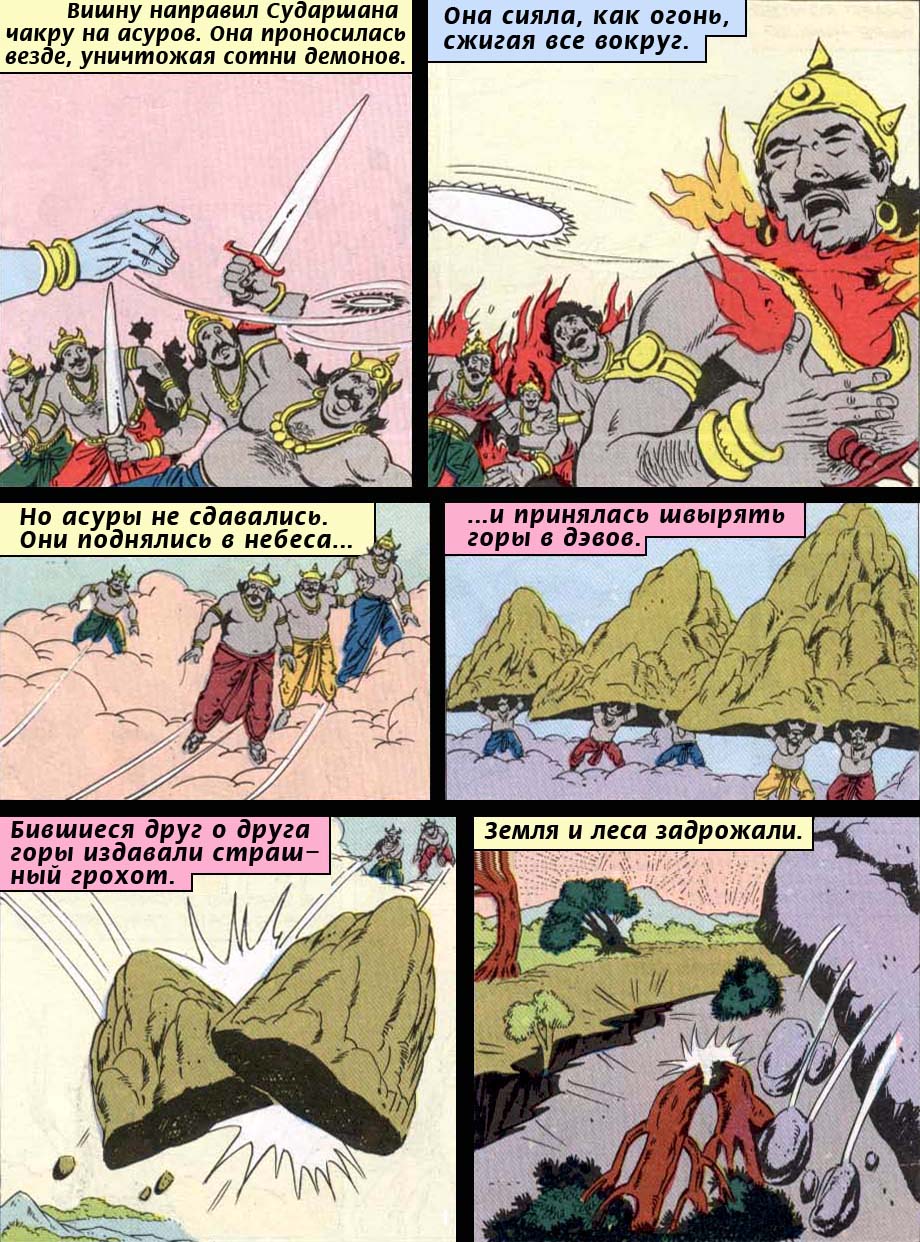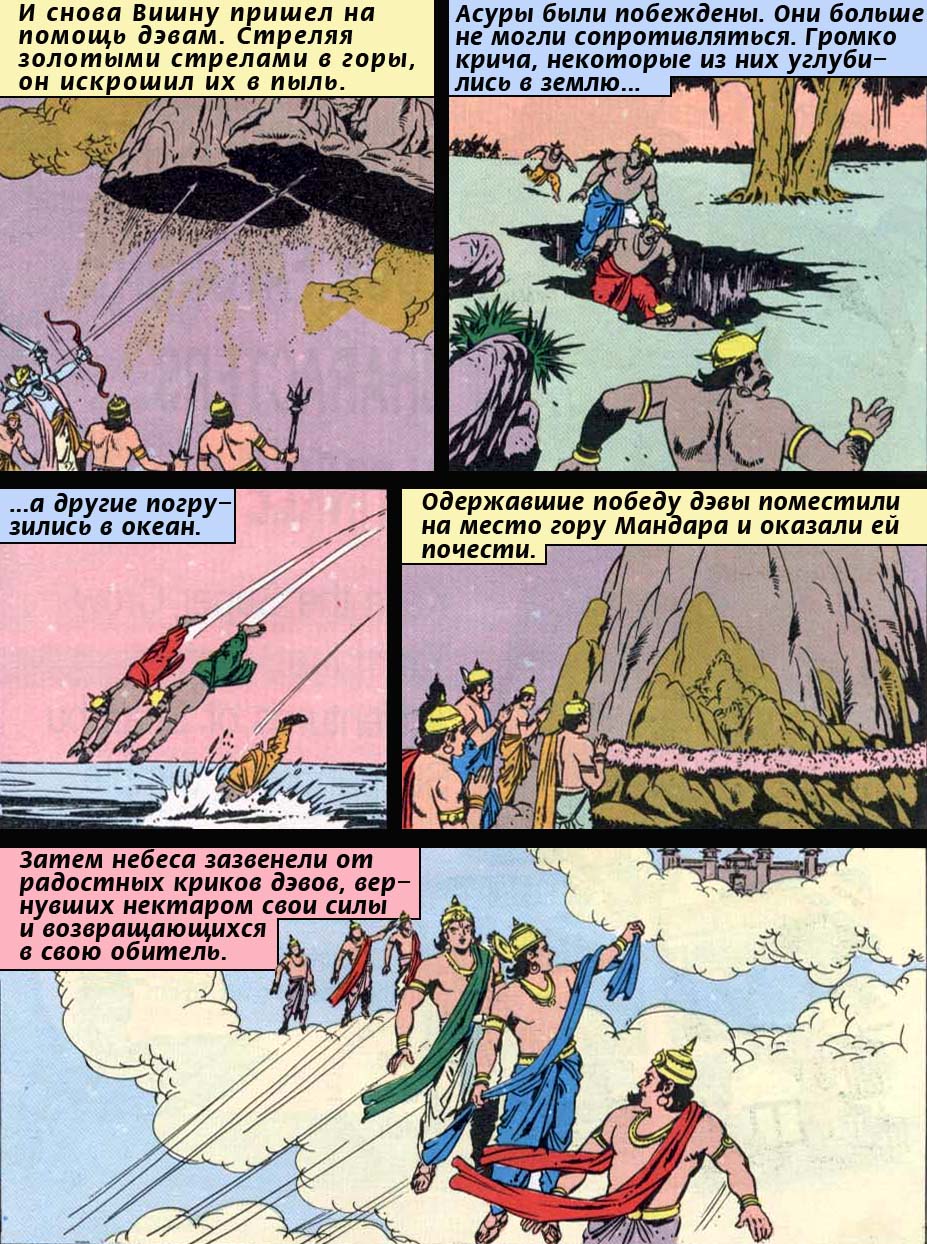 Но тут Нара своими мощными стрелами с наконечниками из чистейшего золота начал разбивать на лету падающие горные вешины; тучи его смертоносных оперенных стрел заслоняли все небо. Великий страх объял рать демонов. Слыша, как яростно заввает в небе диск Сударшана, скусившие горечь поражения предводители асуров спрятались в земле или в глубине соленого моря. Одержав победу над врагами и получив столь желанный нектар, полубоги со всеми почестями водрузили гору Мандару на ее прежнее место. И водоносные тучи, приятно рокоча в небе, уплыли так же, как и появились.