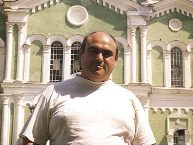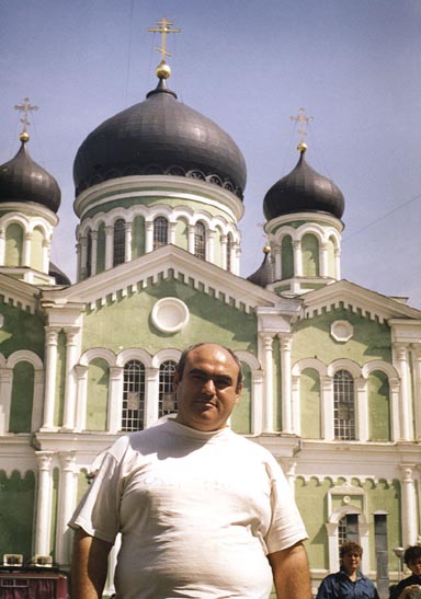 Я и Витя на фоне Троицкого Собора. В собор попасть невозможно. И полно народу, и оцепление. Мы становимся с тысячной толпой перед собором. Благо, через автомобиль с большими динамиками идет трансляция службы. Узнаем по голосу Патриарха Всея Руси Алексия II-го. Он произносит проповедь. Оказалось, это были патриаршие джипы, я потом вспомнил, что неоднократно видел их по телевизору. Минут через десять он выходит, и благословляет толпу. Мы тоже попадаем под Патриаршее благословение. Совсем вблизи, метрах в полутора, за милицейским оцеплением видим Патриарха, он благословляет нас. Он выглядит совсем своим, таким старым знакомым из телевизора. Он уходит, и говорят, что он прослужит праздничную вечернюю и утреннюю службы, после чего тут же улетит на вертолете в Москву. Следующий актуальный вопрос, который беспокоит меня - поселение. Мы узнаем, что в одном из корпусов монастыря занимаются расселением паломников. Идем туда. Там толпа народа, много священников, монахов. Тут же сидит сестра, молодая монахиня замученного вида с кипами конторских книг. В книгах у нее адреса жителей Дивеево, которые соглашаются брать на квартиру постояльцев. После каждой фразы она добавляет "Благословите". Она спрашивает, сколько нас, я говорю - трое. Она переспрашивает: "Три брата?". Мне требуется целых две секунды, чтобы осознать смысл вопроса. "Да" - наконец, отвечаю я. Нам выдают адрес, по которому мы можем поселиться. "Благословите" - машинально добавляет она. Мне не жалко благословить ее, призвав на ее голову все мыслимые благословения, но в присутствии десятков священников и монахов я не решаюсь, и ограничиваюсь банальным: "Бог благословит". Выходя со двора, мы встречаем женщину с пустыми ведрами. Я не верю в приметы, но на этот раз примета срабатывает. Два часа поисков, сначала - квартиры, а после - хозяйки приводят к информации, что у нее уже занято, а освободится "только завтра". Тут возникают идеи переночевать в машине и другие, Витей овладевает срочная жажда приобретения духовной литературы. Я давлю упаднические настроения, и мы возвращаемся обратно к гостиничному корпусу искать поселения. Видим тетку, которая пристает к очереди, я соображаю, что она приглашает поселиться, тут же обращаюсь к ней, и мы сговариваемся. В Дивеево одна койка стоит обычно рублей 25, это в квартире со всеми удобствами. Тетка просит 20, но у нее дом с туалетом во дворе. Она, впрочем, обещает нам протопить баню и предоставить отдельную комнату на троих. Мы соглашаемся - много ли трем мужикам надо? Едем к ней. Машину оставляем на улице, так как въезда во двор нет. Баню требуем сегодня же. Я занимаюсь приготовлением пищи. Через некоторое время мы едим, потом - баня. Саша с Витей, к удивлению хозяев, которые к этому непривычны, остаются париться. Витя через некоторое время выходит, а Саша еще долго-долго парится в одиночестве, горюя, что некому похлестать ему спинку веником. Ф-фух. Наконец-то, мы, чистые, сытые, с ночлегом и в Дивеево. Можно переключиться на духовные вопросы. Мы решаем пойти на вечернюю службу, попасть в храм и приложиться к мощам Преподобного. Мы идем в храм к вечеру, некоторое время спустя после начала службы. Вход перекрыт оцеплением. В северный придел стоит огромная очередь. Очередь, как, прости Господи мне такое сравнение, в мавзолей Ленина. Мы становимся в нее. Некоторое время стоим вмес
