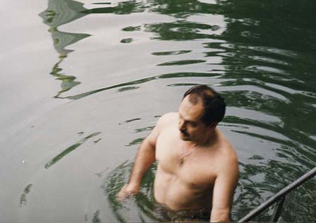 Мы с Витей на фоне источника Мы идем купаться. Тут оборудованы купальни, но можно купаться и вне них. Большие таблички призывают женщин не купаться обнаженными. Мы раздеваемся до плавок, и ныряем. Вода ледяная настолько, что вызывает ощущение кипятка. Мы с Витей, крестясь, окунаемся трижды, крестимся, и тут же выныриваем и выходим.