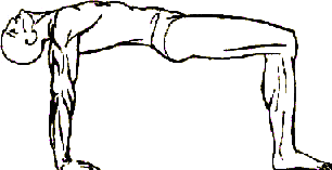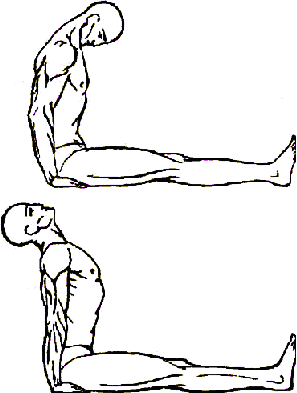 - Начинаем с того, что запрокидываем голову как можно дальше назад-вверх. Затем переходим в положение, при котором тело напоминает острый угол, вершиной направленный вверх. Одновременно движением шеи прижимаем голову подбородком к грудине. Стараемся при этом, чтобы ноги оставались прямыми, а прямые руки и туловище находились в одной плоскости. Тогда тело окажется как бы сложенным пополам в тазобедренных суставах. Вот и все. После этого возвращаемся в исходное положение - упор лежа прогнувшись - и начинаем все сначала.